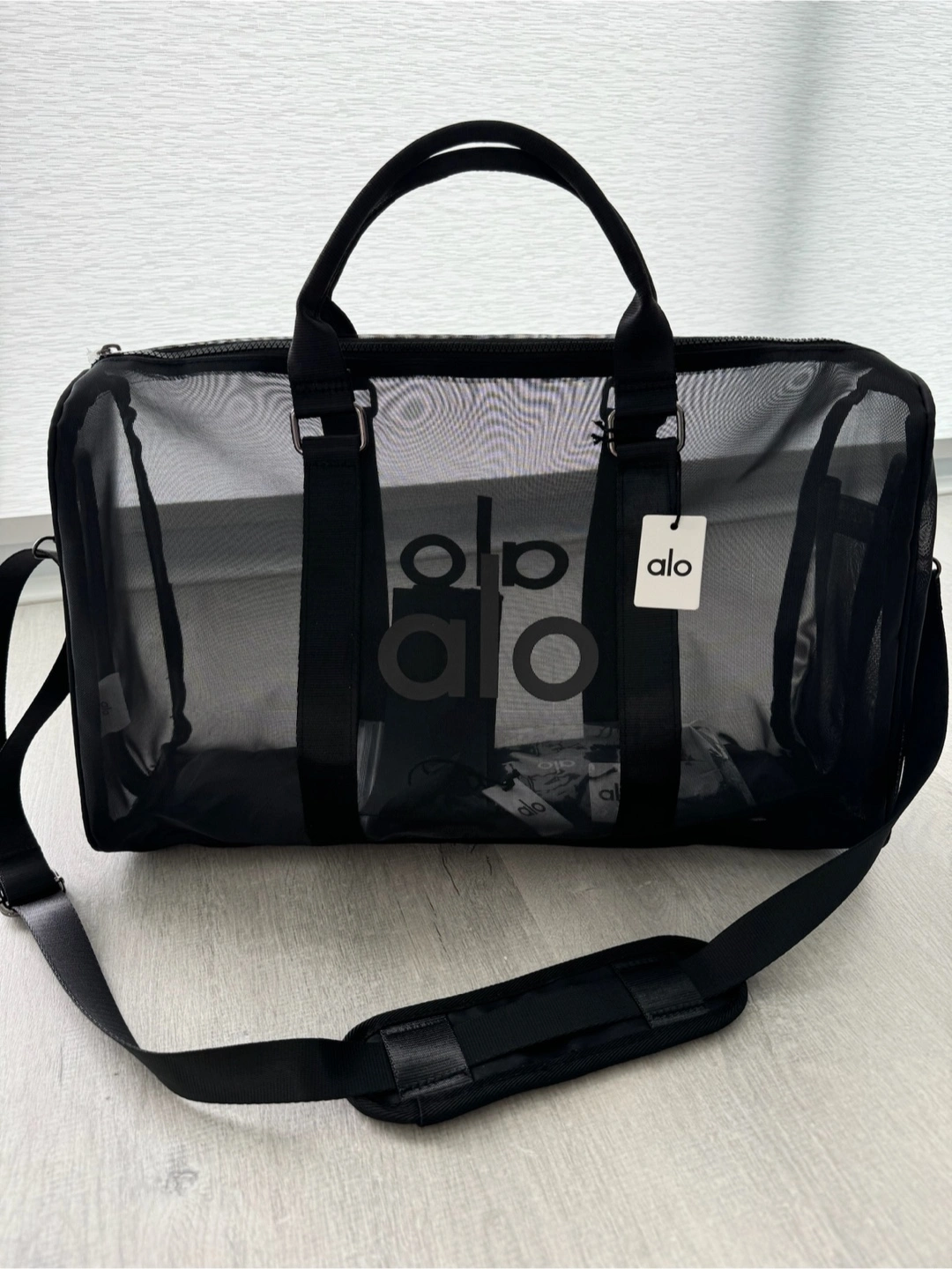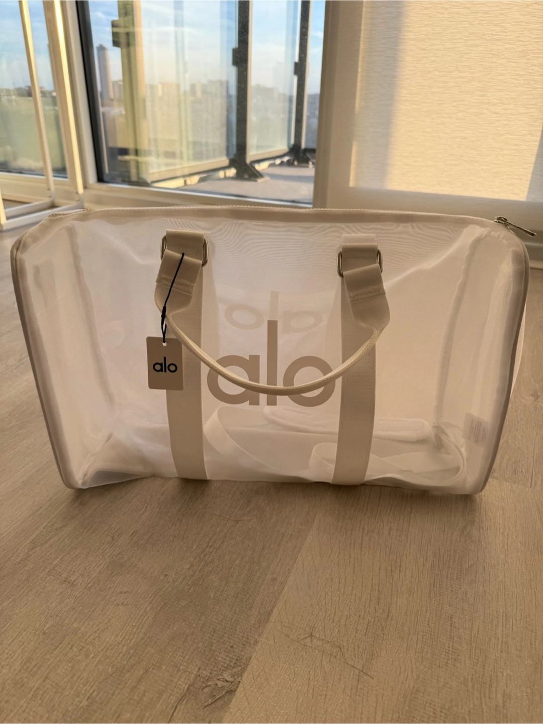 Selling this Alo Yoga Sheer Duffle bag, perfect for weekend trips or beach days! It features a see-through, structured design with a flat bottom, comfortable top handles, and a detachable shoulder strap. Retails are for $518!