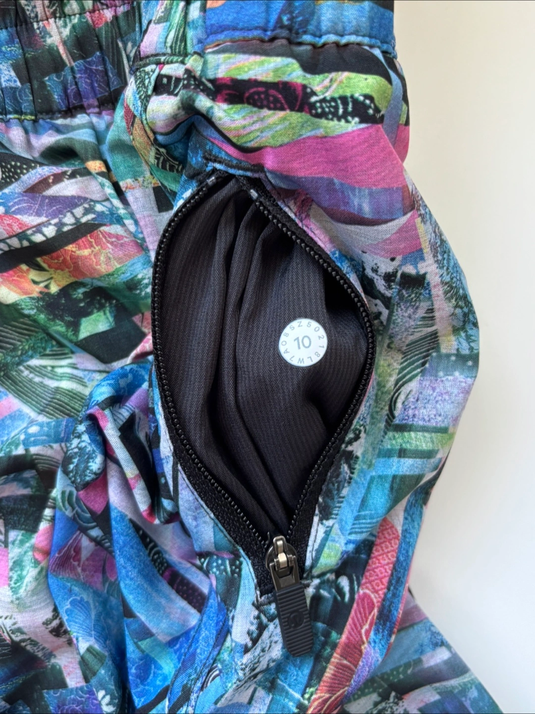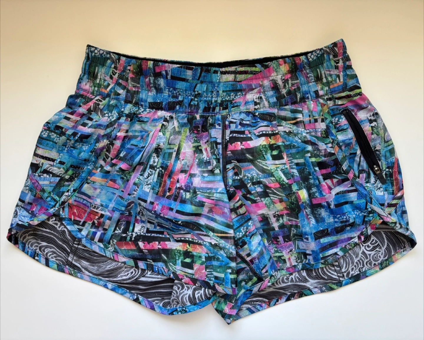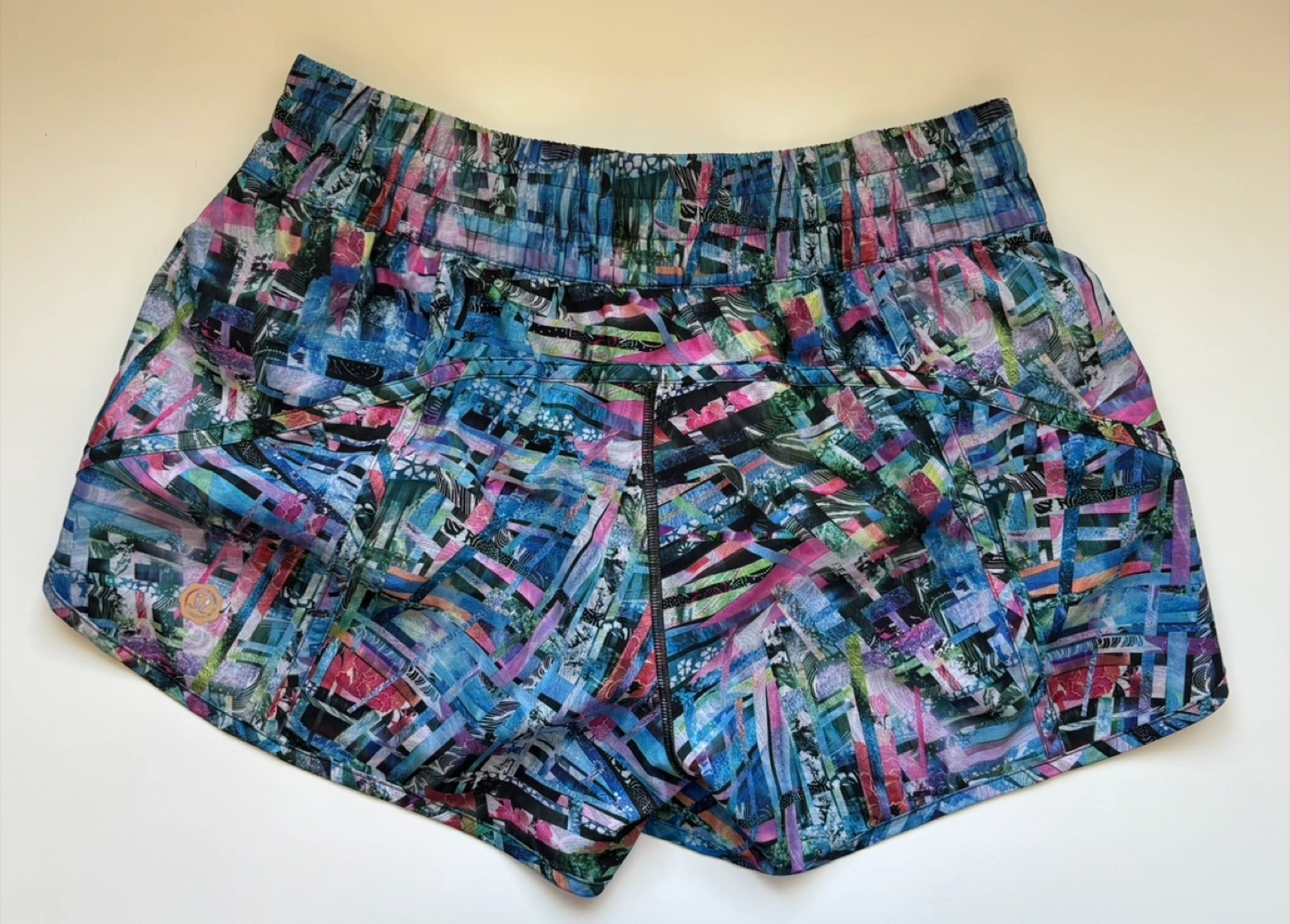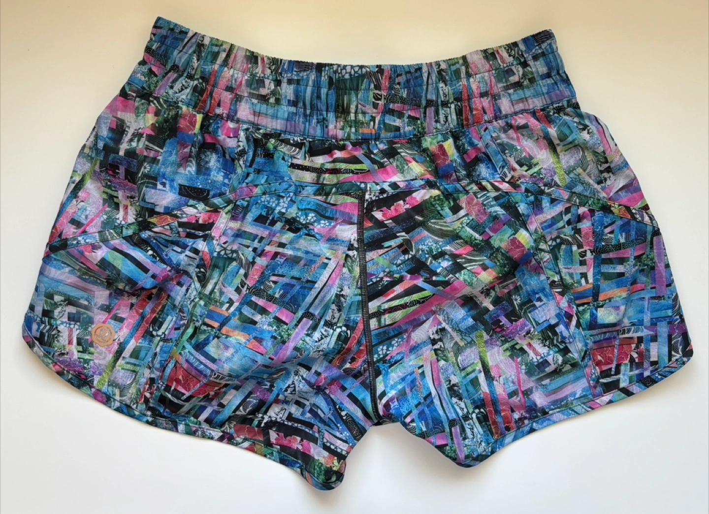 Selling a pair of Lululemon running shorts in size 10! They have a fun, colourful pattern and a convenient zippered pocket. The inseam is approximately 3 inches. Perfect for your next run or workout