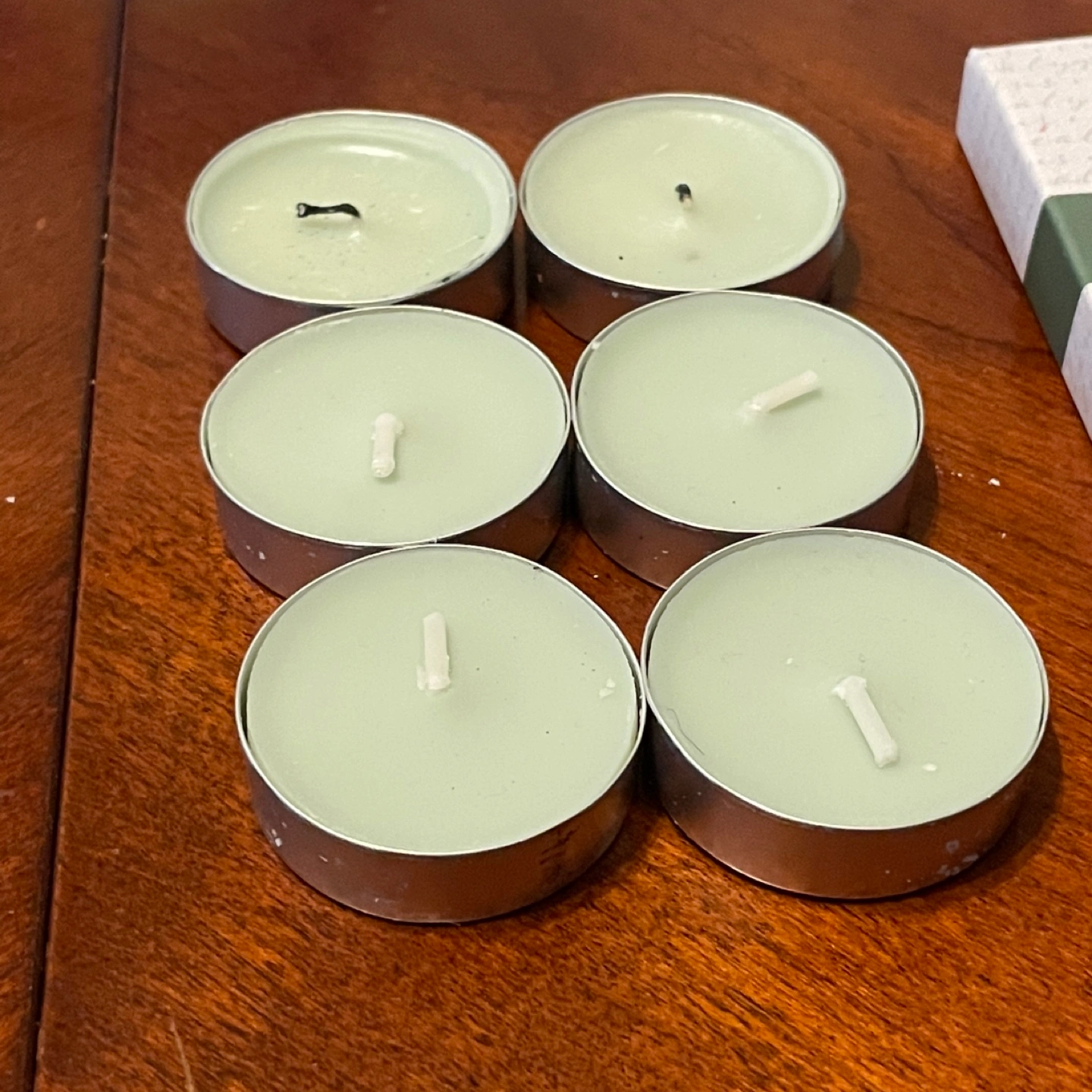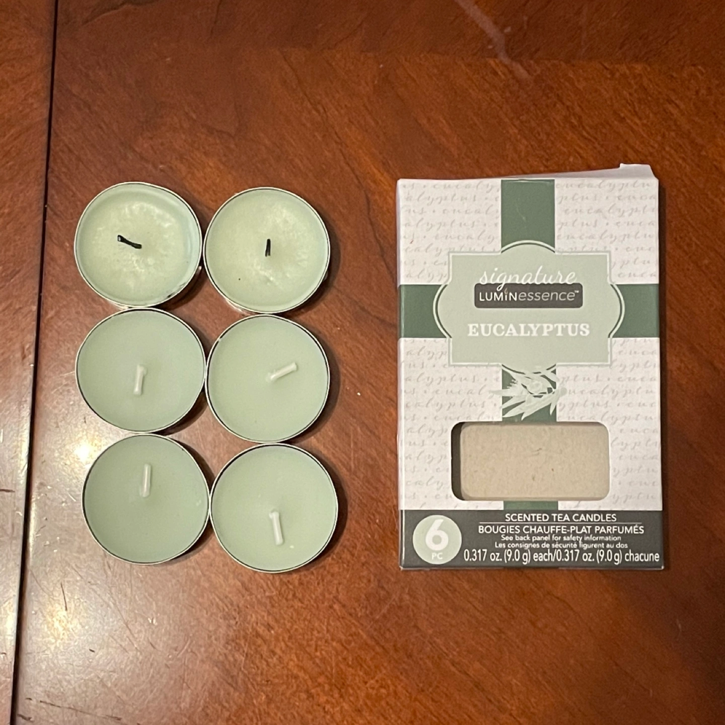Signature Luminessence Eucalyptus scented tea candles. There are 6 candles included in the box. The candles are 0.317 oz (9g) each. Two of the wicks have been burnt, slightly affected the wax