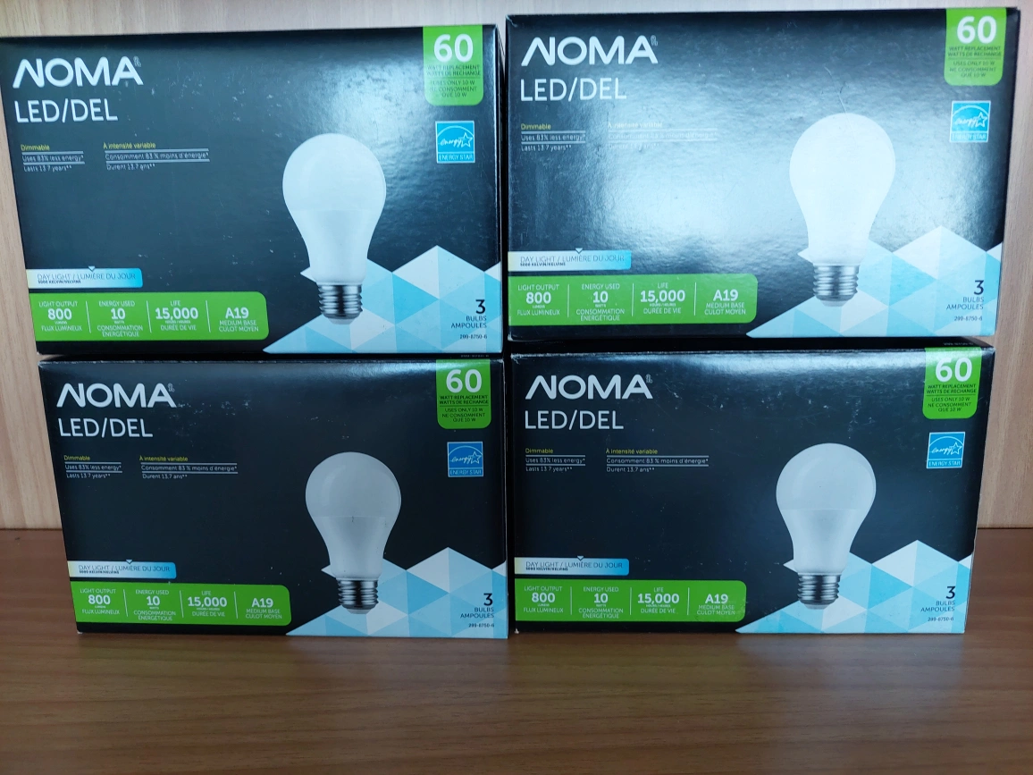 Selling 4 packs of NOMA LED light bulbs. These are a 60W replacement bulb that only uses 10W of energy! They're dimmable and are rated to last for 15,000 hours or 13.7 years.