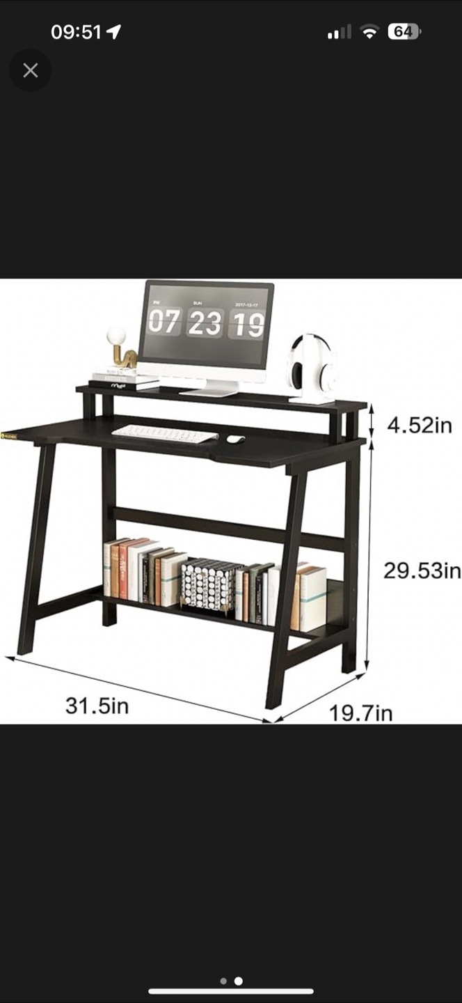 Selling a black computer desk with a shelf! It's a great size for a home office or study space. The desk has a sleek design and provides ample room for your computer, keyboard, and other accessories. The dimensions are approximately 31.5 inches wide, 19.7 inches deep, and 29.53 inches high.