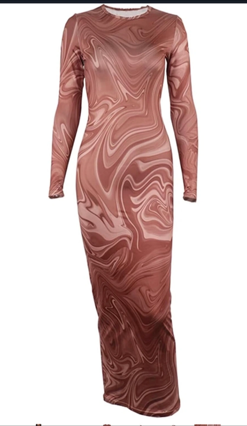 This is a long sleeve maxi dress with a brown marble print. It's a stylish and eye-catching piece that would be a great addition to your wardrobe. Its stretchy and could fit medium and large