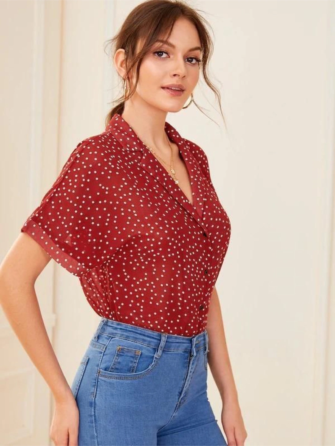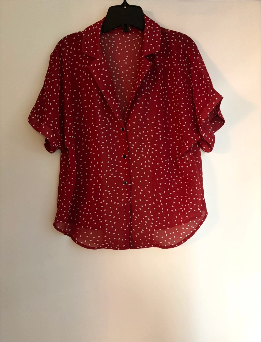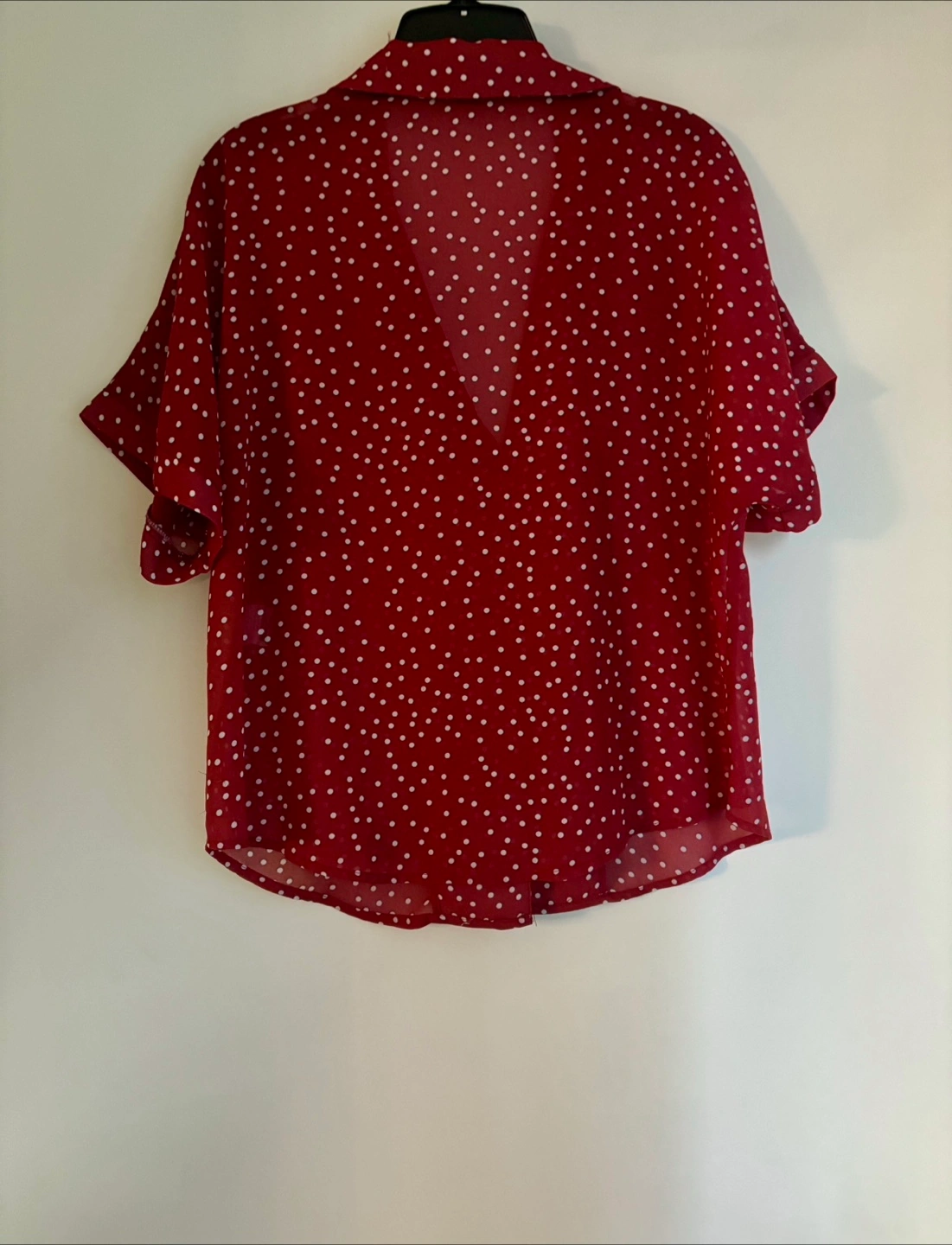 627A cute button up red blouse with white polka dots! Size medium. Perfect for adding a pop of colour to your wardrobe, casual or work clothes. Super summery. Please feel free to take a look at my other listings to make bundles! Most items are $10 or less! 🧺