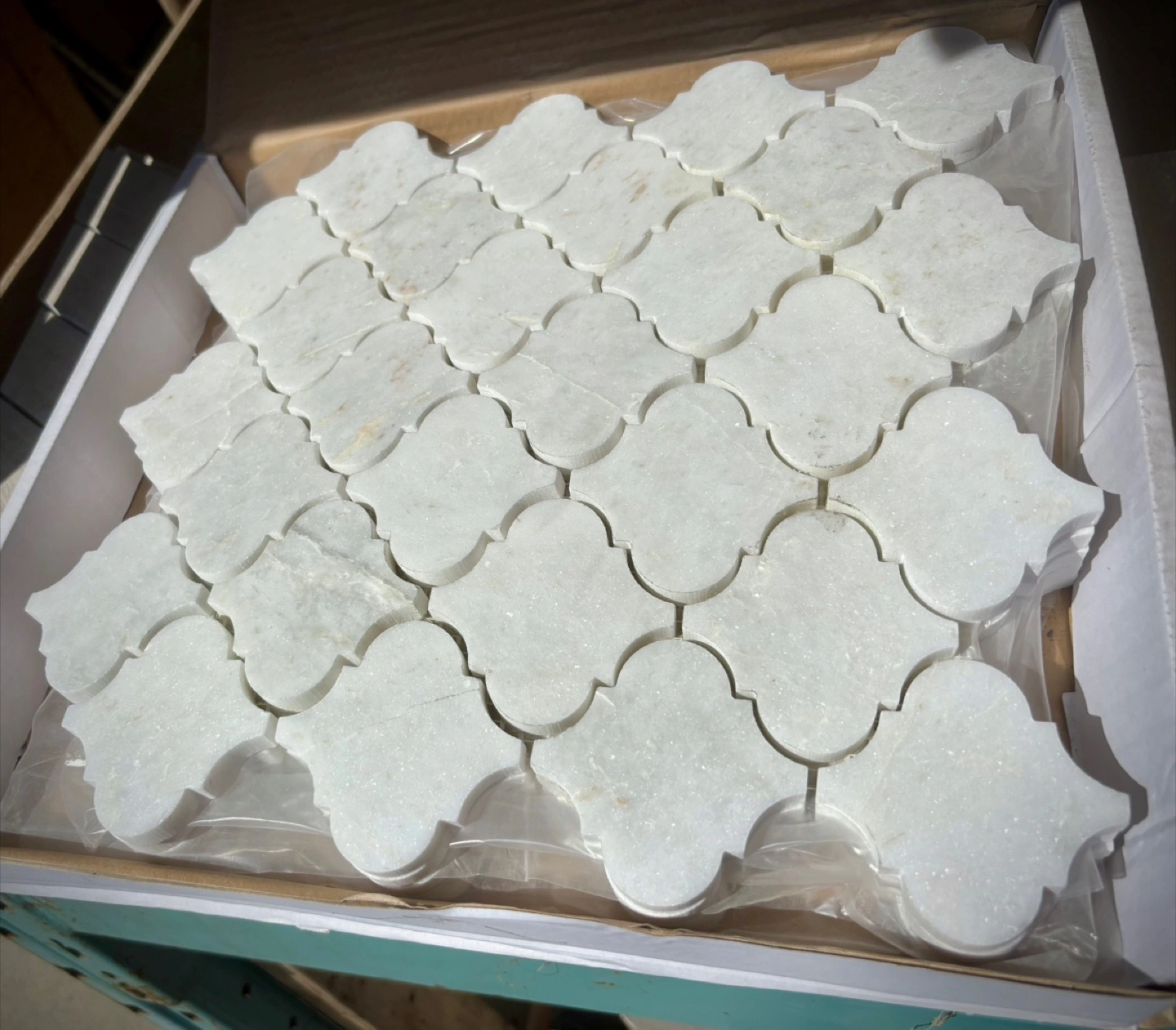 Selling a box of Sienna White Marble Arabesque Mosaic tiles.