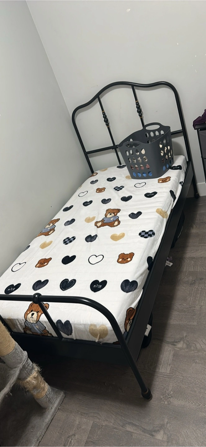 Selling a twin size bed frame with a black metal finish. It's in good condition and ready for a new home! Perfect for a kid's room or a guest room