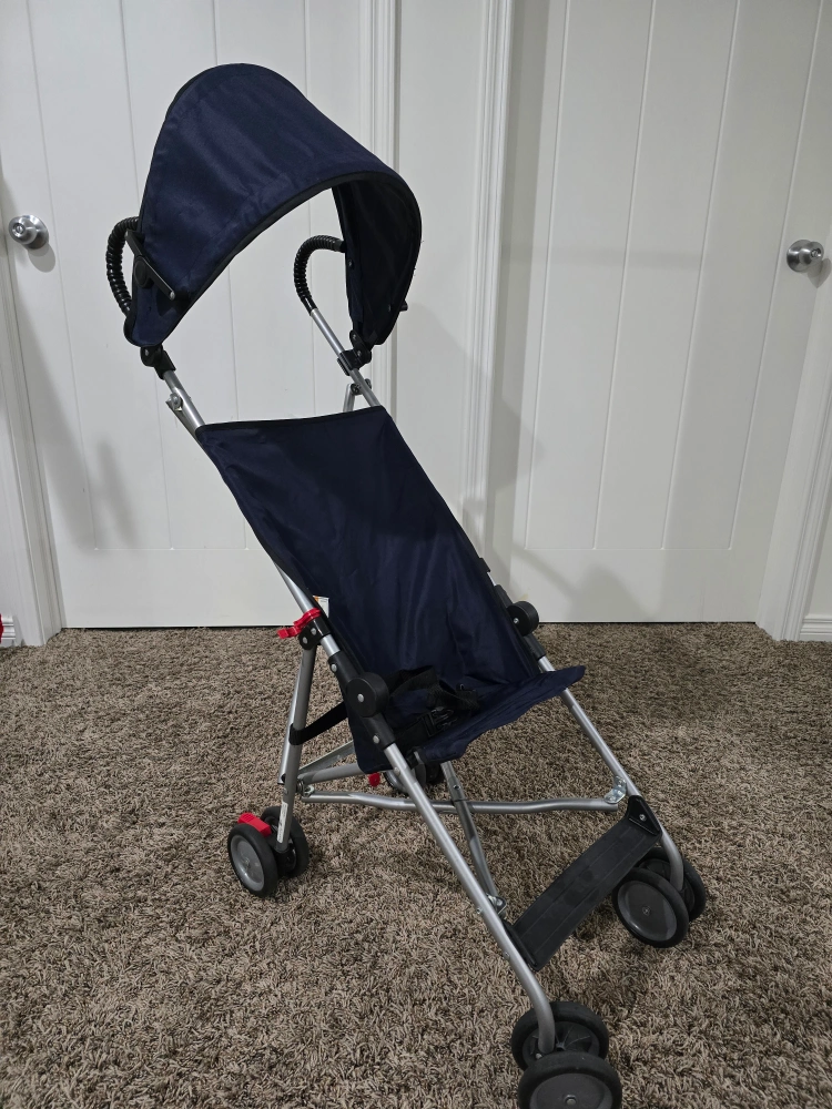 Here's a lightweight umbrella stroller in navy blue! It's in great condition and ready for your little one's adventures around town. Easy to fold and store, perfect for travel or quick errands