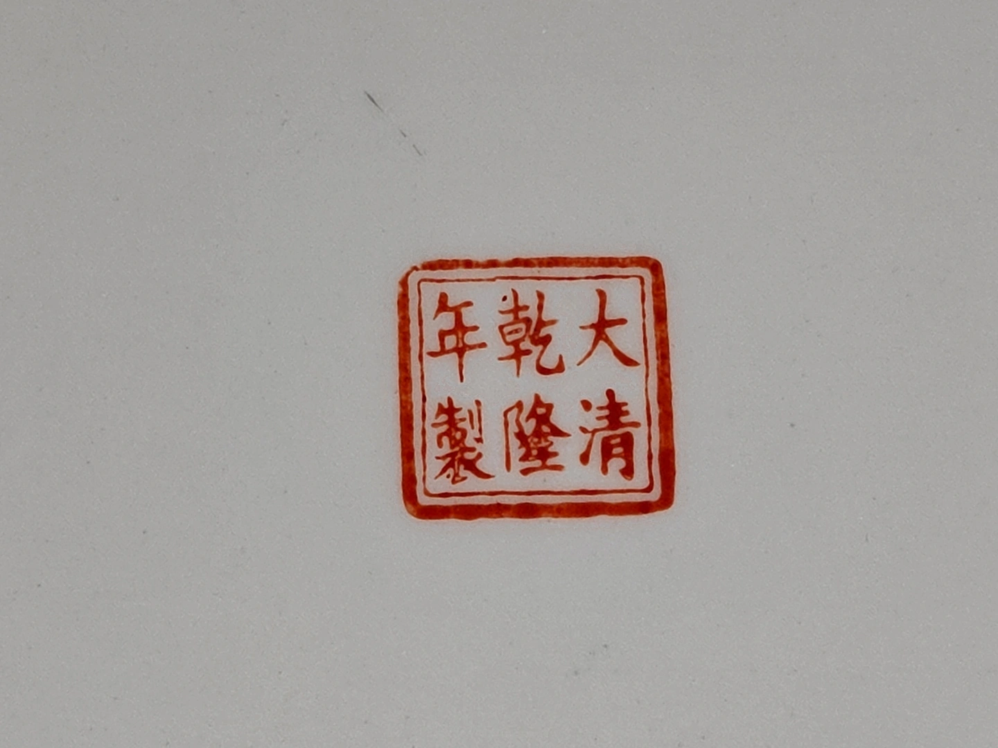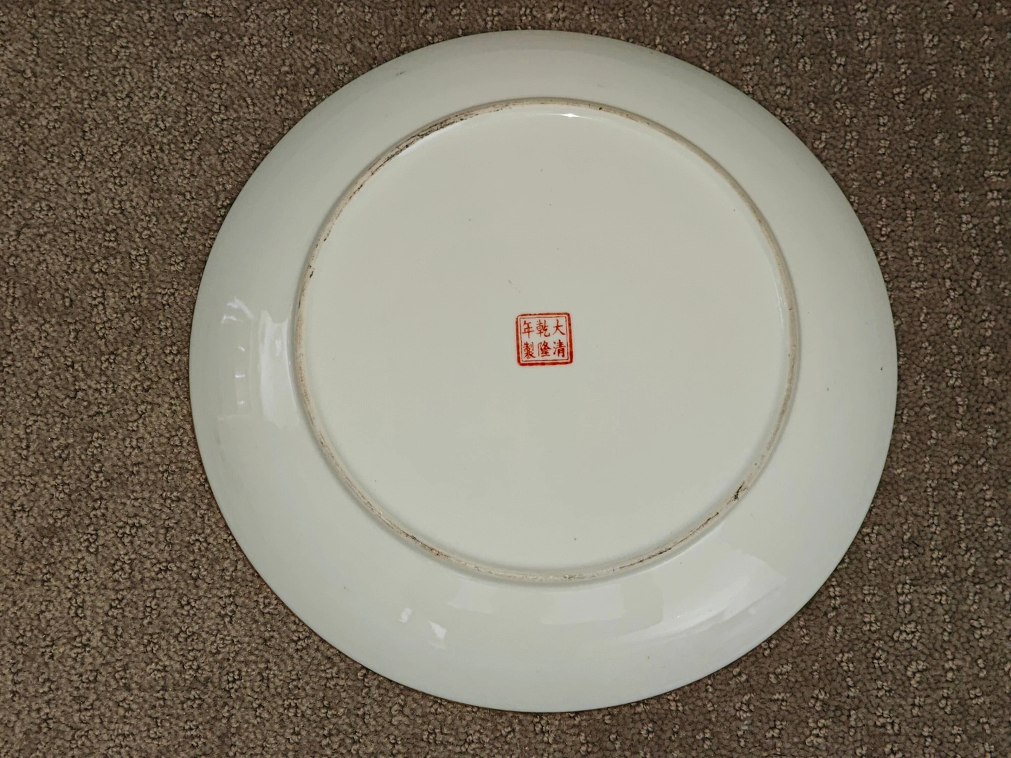 On the back of the plate is a distinct red seal mark that reads 大清乾隆年製 (Dà Qīng Qiánlóng Nián Zhì), which translates to "Made in the Qianlong Reign of the Great Qing Dynasty." While this mark is often used on later pieces to honor earlier periods, it is a significant detail that adds to the plate's historical interest and decorative appeal.