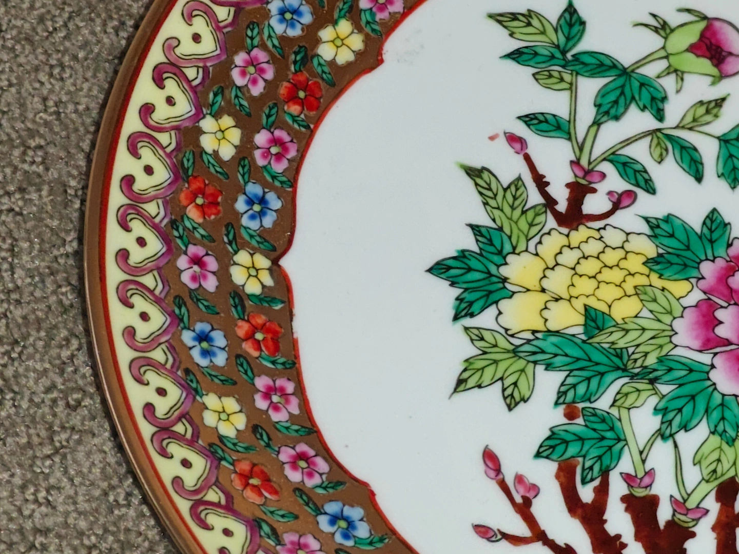 The outer rim is equally decorative, with a stylized border of small, colorful flowers and a delicate heart-like pattern in a rich pink tone, all on a warm, golden-brown background.
