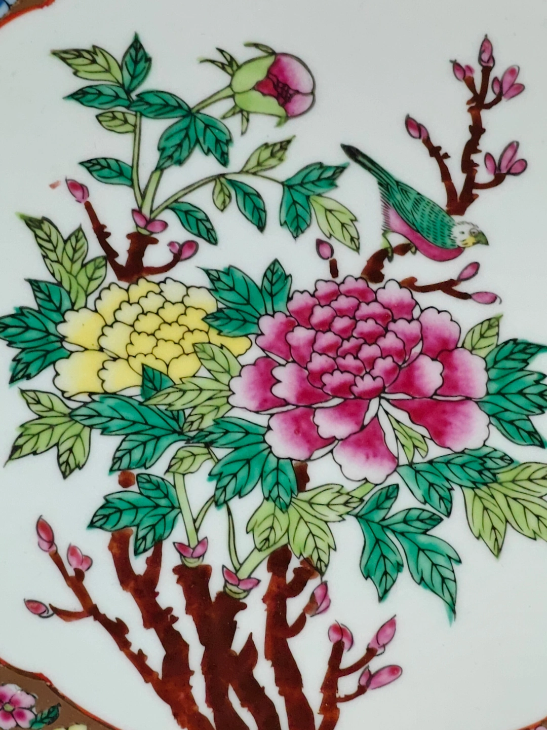 The plate features a meticulously hand-painted design in the vibrant Famille Rose palette. The central motif is a beautiful arrangement of colorful peonies—a traditional symbol of prosperity and honor—along with two finely detailed birds perched among the branches. The delicate stenciling and vibrant colors are a testament to the skill of the artist.
