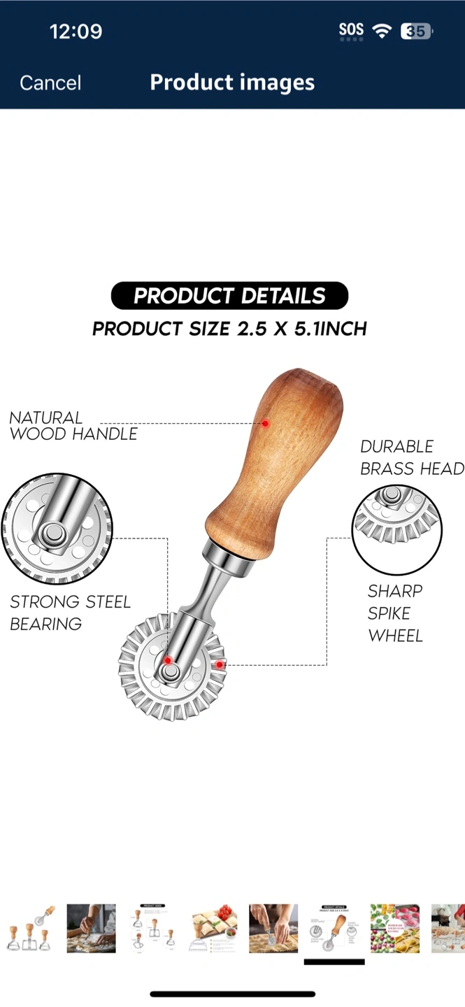 76This pasta/dough cutter is perfect for making homemade pasta and pastries! It features a natural wood handle, durable brass head, strong steel bearing, and a sharp spike wheel. Product size is 2.5 x 5.1 inches