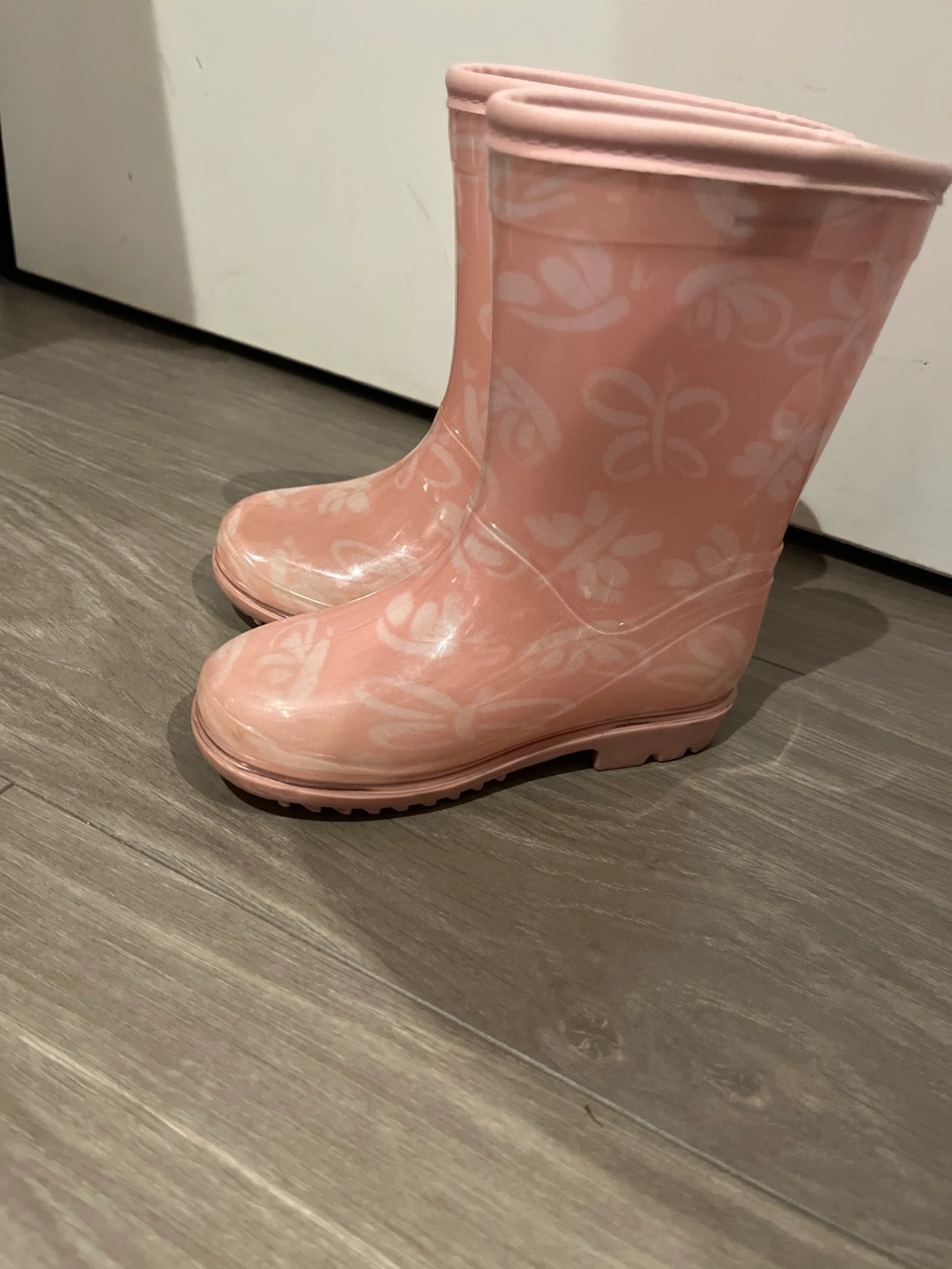 Selling a pair of pink rain boots in size 8. They have a cute butterfly pattern and are perfect for puddle jumping! Great for keeping little feet dry on rainy days