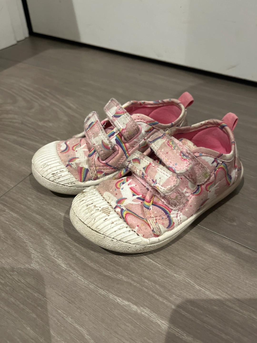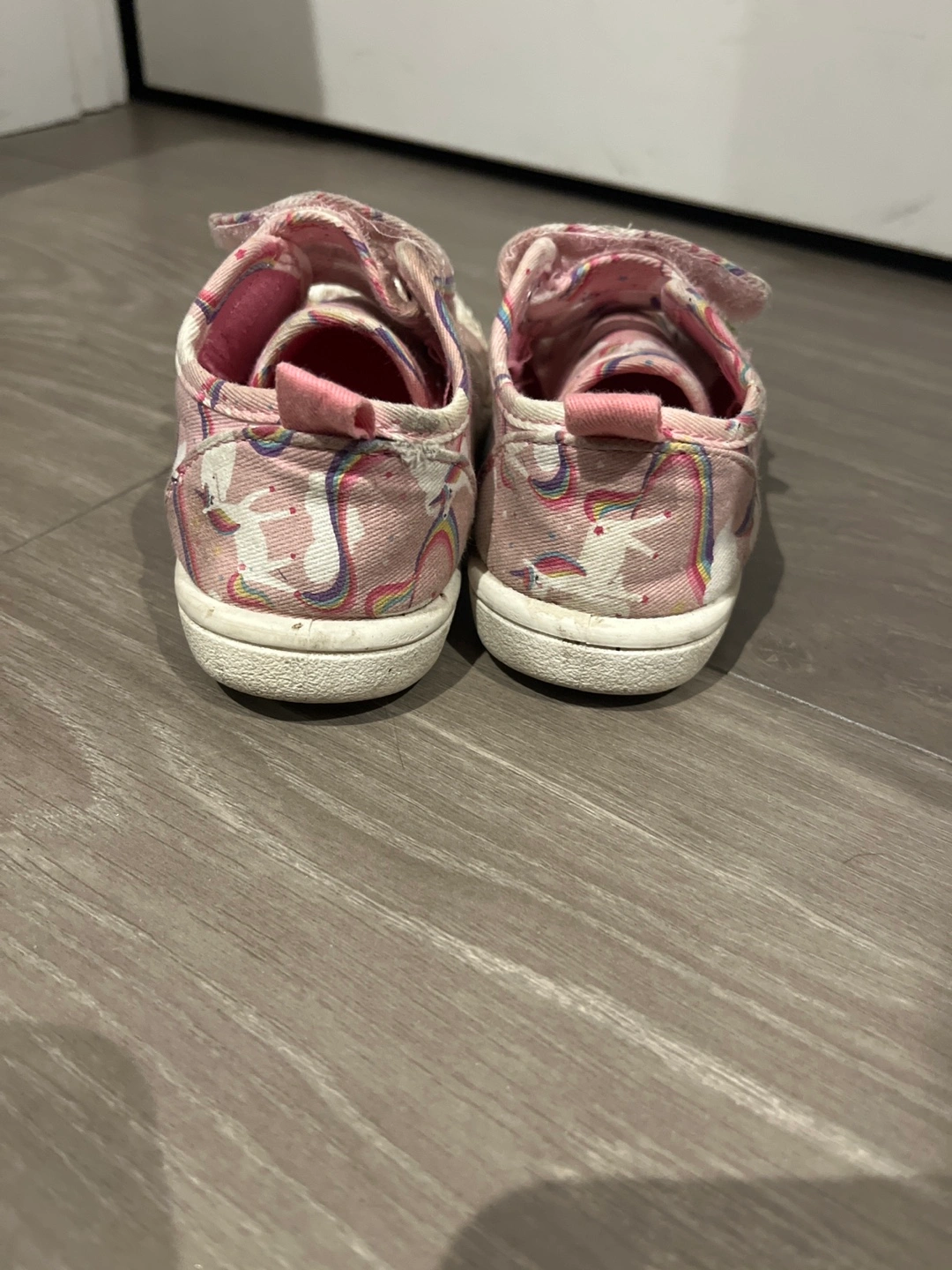 These adorable pink sneakers feature a fun unicorn pattern! They show some signs of wear, as you can see in the photos, but they still have lots of life left in them. Perfect for a little one who loves unicorns!