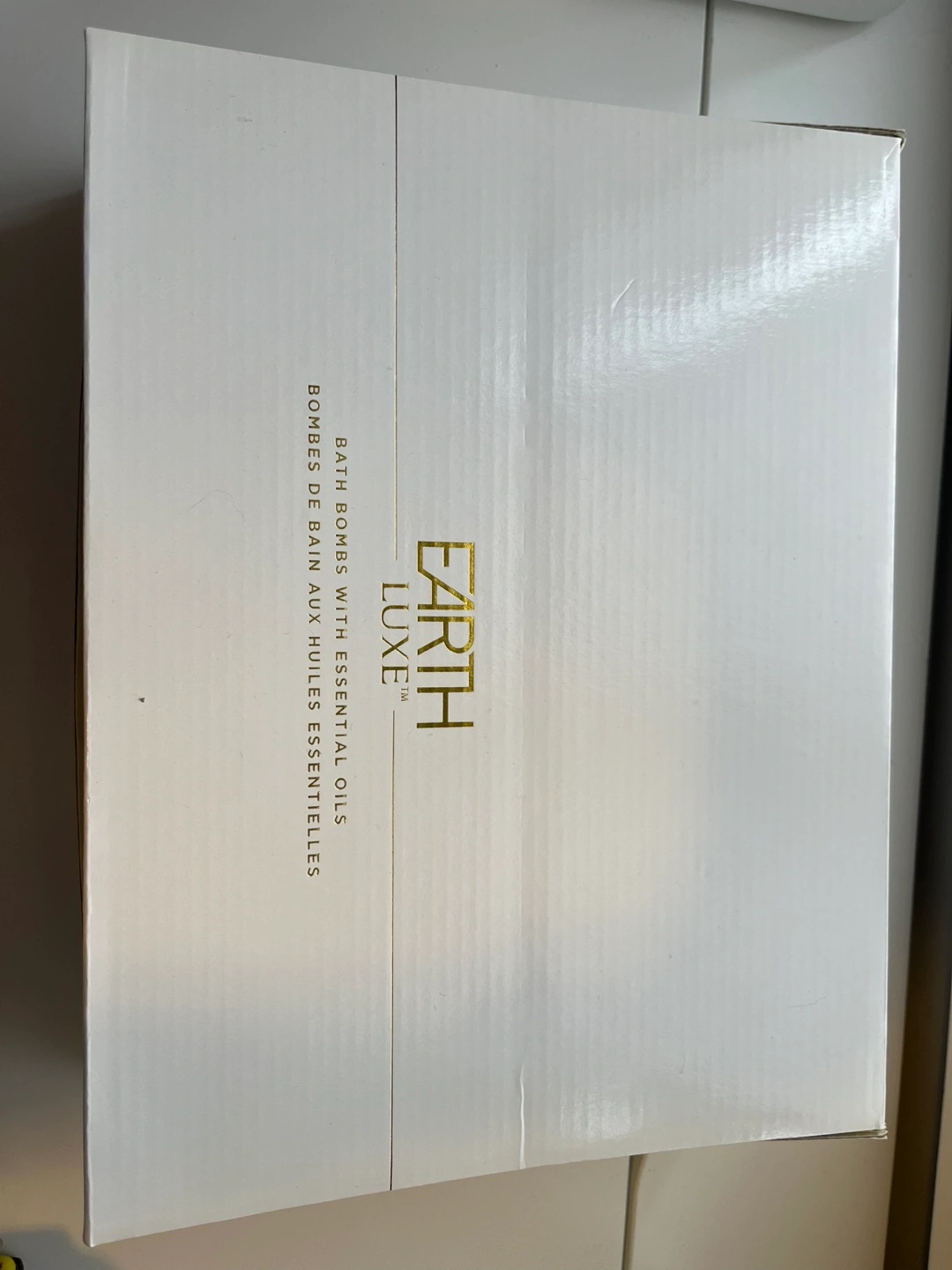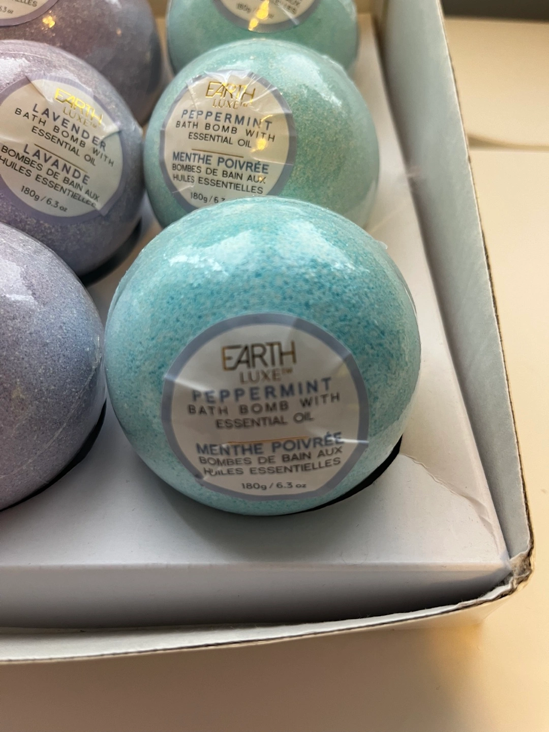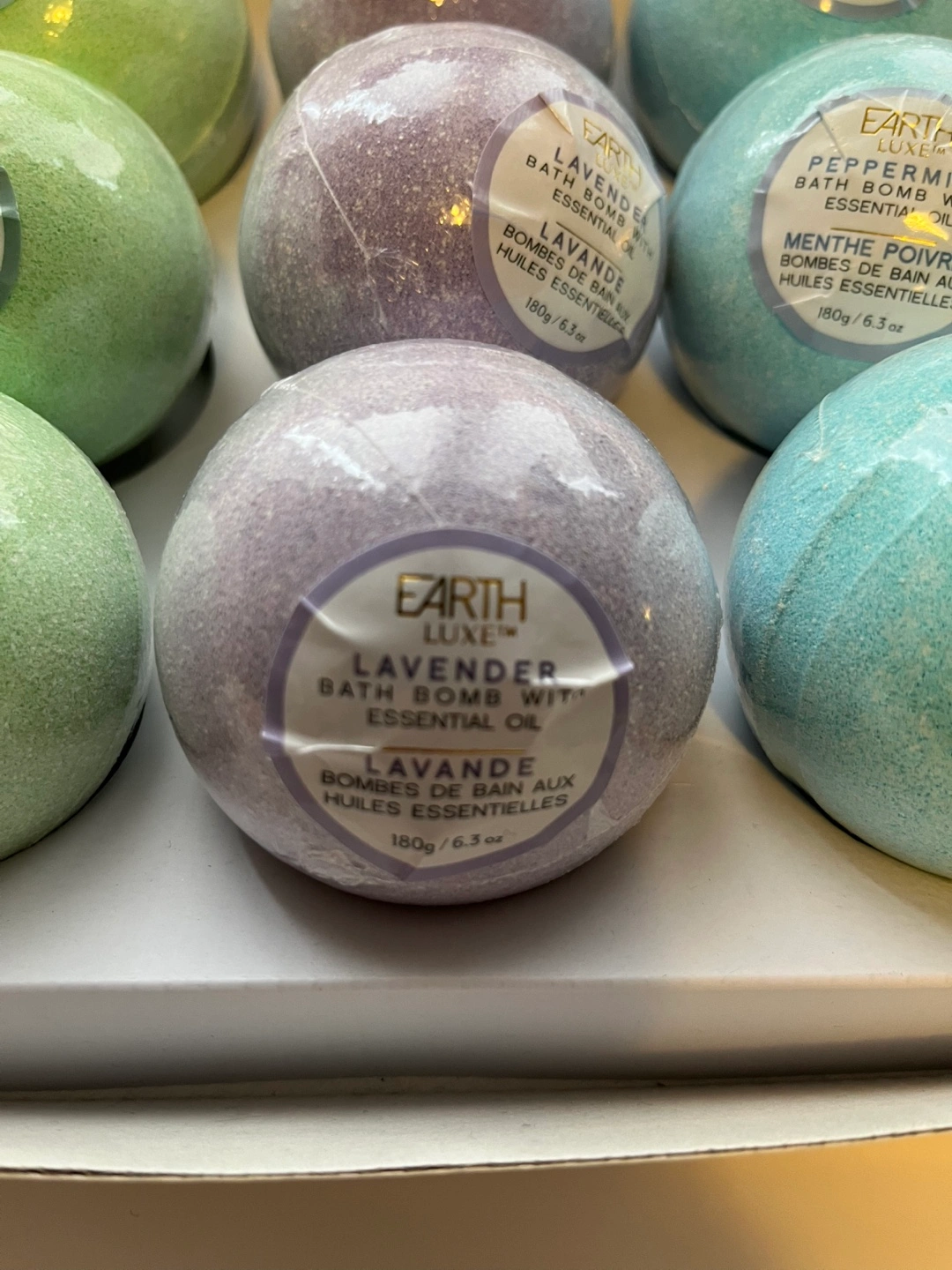 Box of 12 Earth Luxe bath bombs with essential oil, 180g/6.3 oz size. They come in a variety of scents including lavender, peppermint, citrus, and eucalyptus. Perfect for a relaxing bath!