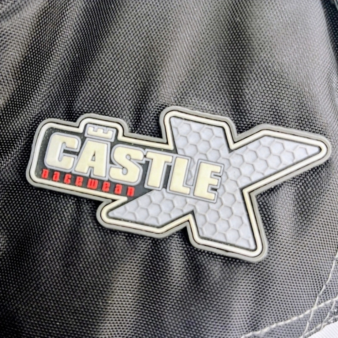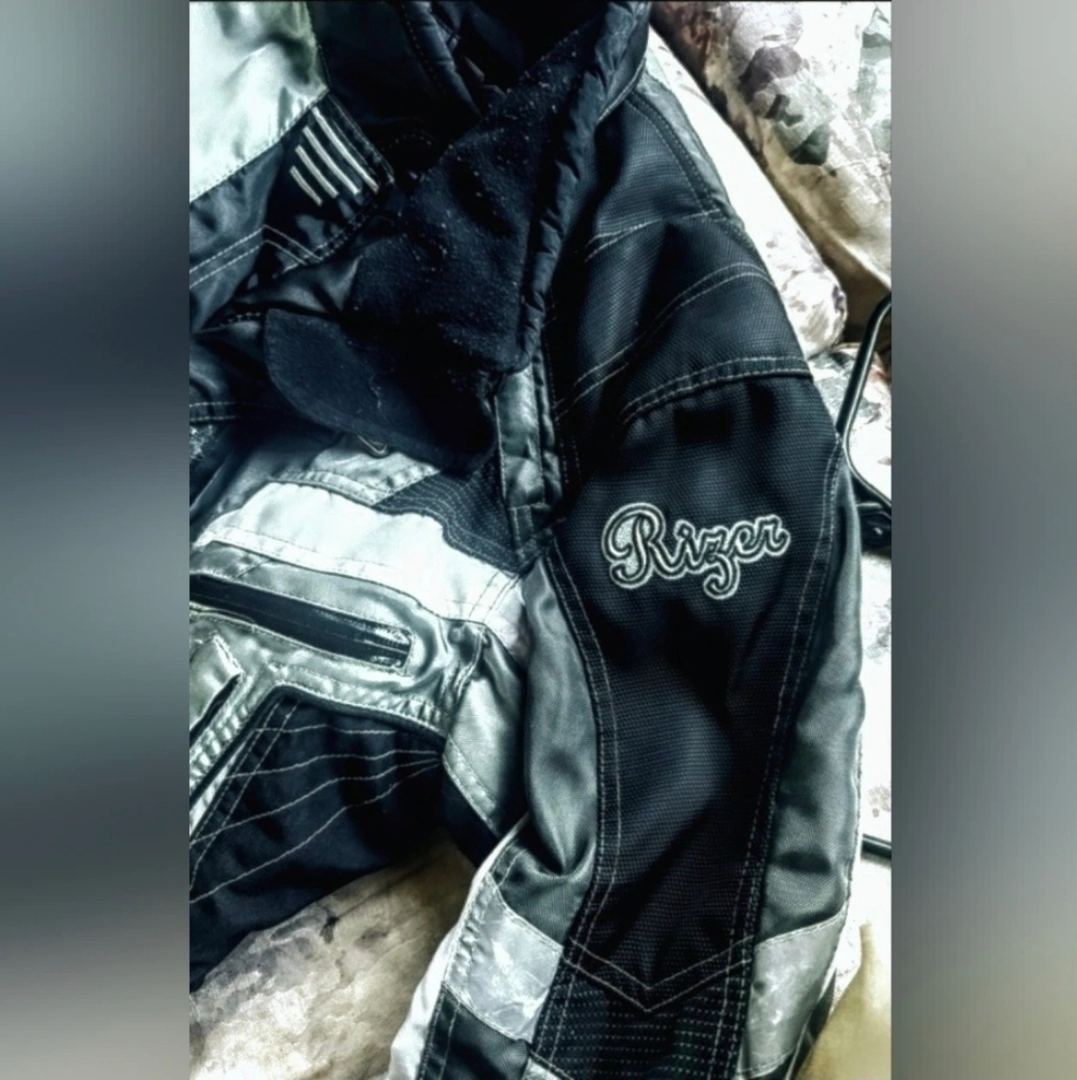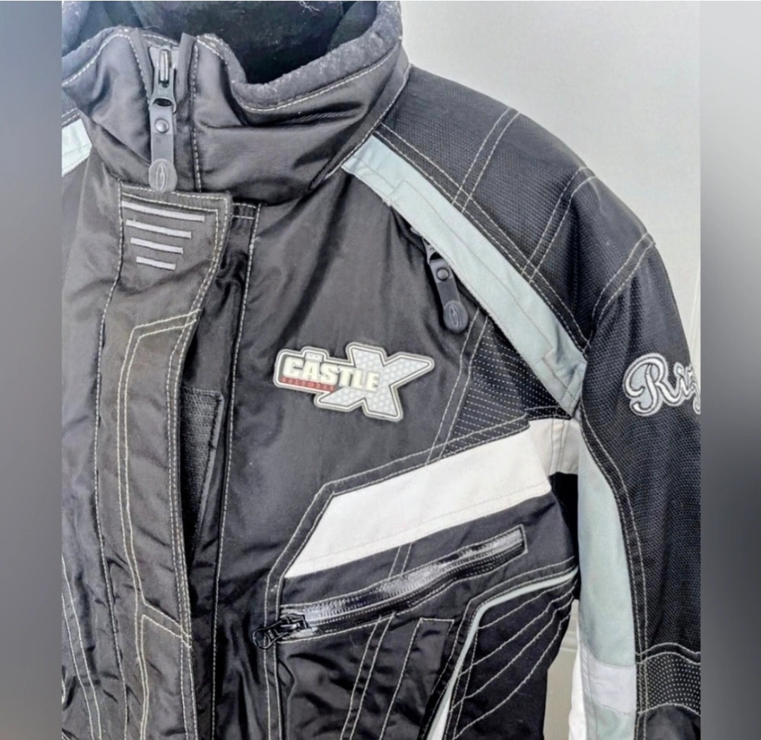 The Jacket is black with gray & white accents. It's made of polyester and nylon. It features a windproof design with adjustable wrist cuffs and waist, reflective elements, and insulation for warmth. It has both button and zipper closures, a visible Castle X Racewear Logo on the left Pec as well as the Rizer logo on the left shoulder which means this particular jacket is from the Castle X Rizer Snowmobile/Winter Jackets Collaboration.