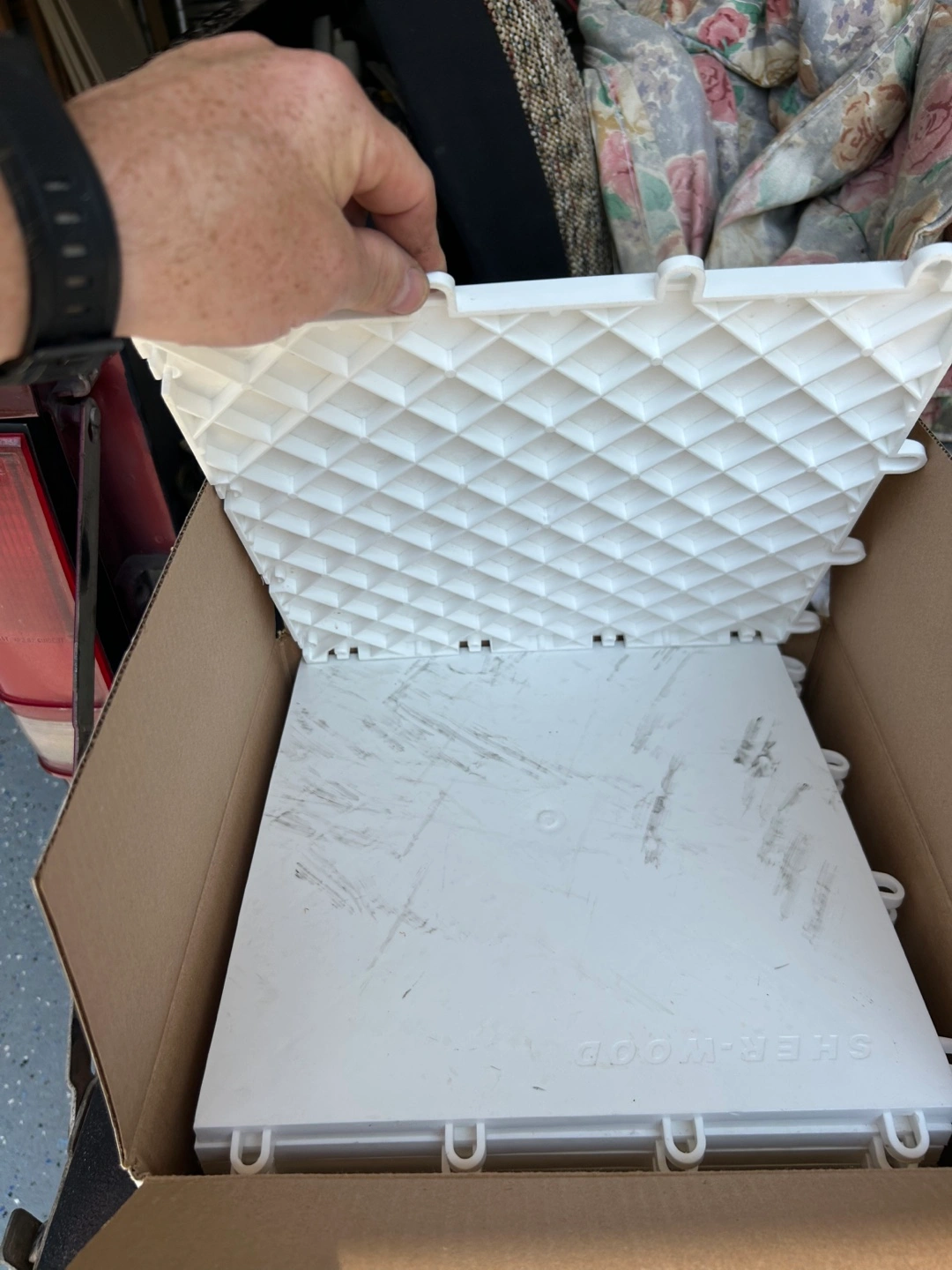 Selling a box of Sher-Wood hockey tiles! The box includes 12 pieces, each measuring 12x12 inches. They're designed to connect quickly and easily, making them perfect for creating a smooth surface for skating. The tiles are solid, durable, and UV resistant, ideal for garages or basements. Originally priced at $79.99, this set is ready for a new home!