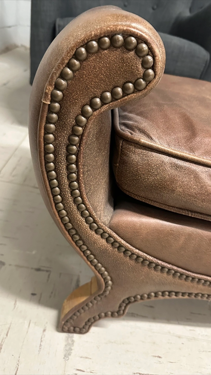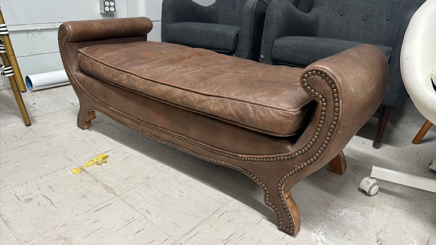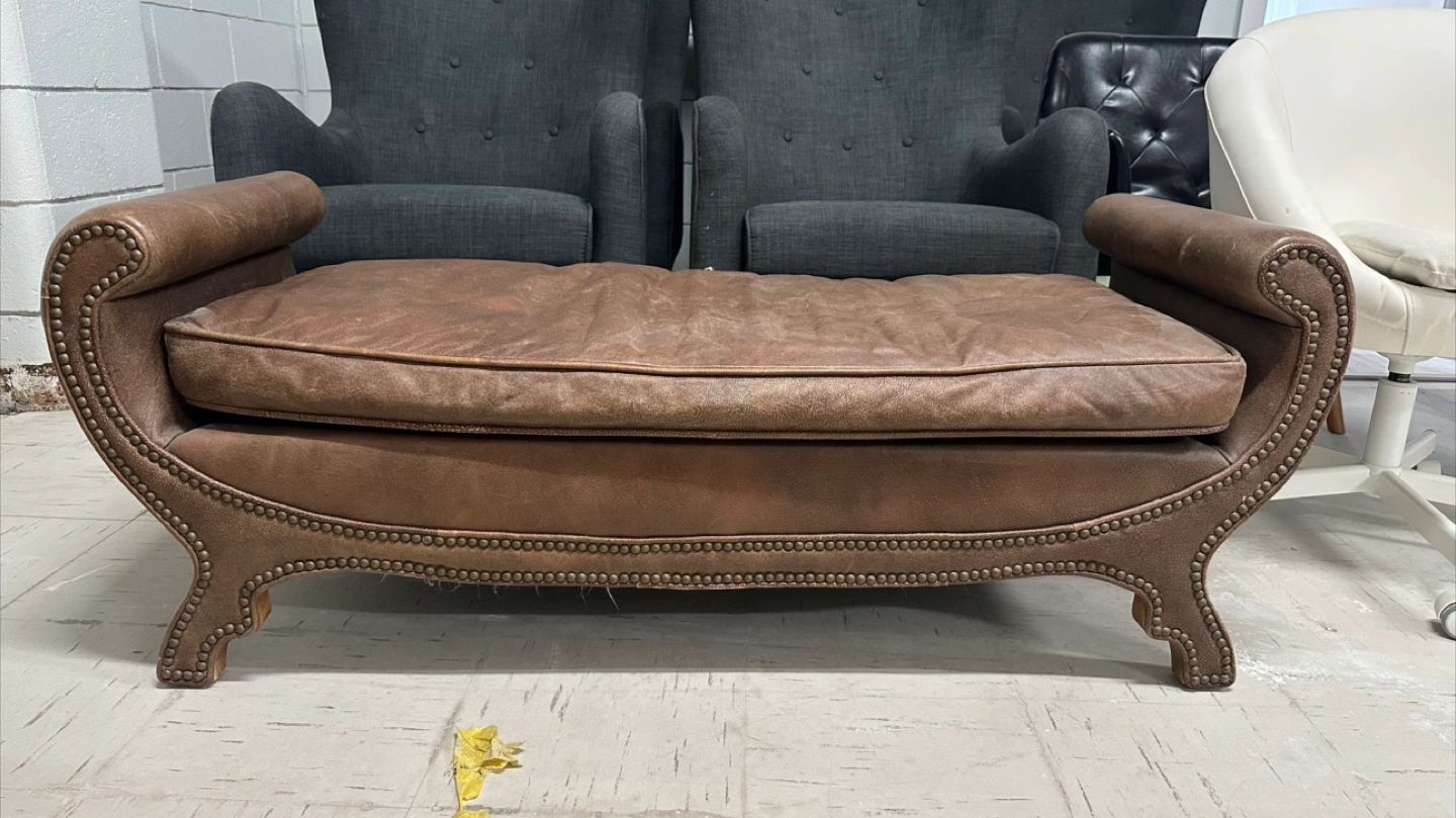 Here's a stylish brown fabric leather ottoman bench. It has a unique design with nailhead trim and curved arms. It would be a great addition to any living room or bedroom! In excellent condition Imported from Bali and frame is solid wood 52” wide 19 depth 20 height Pick up in the downtown area Cash only