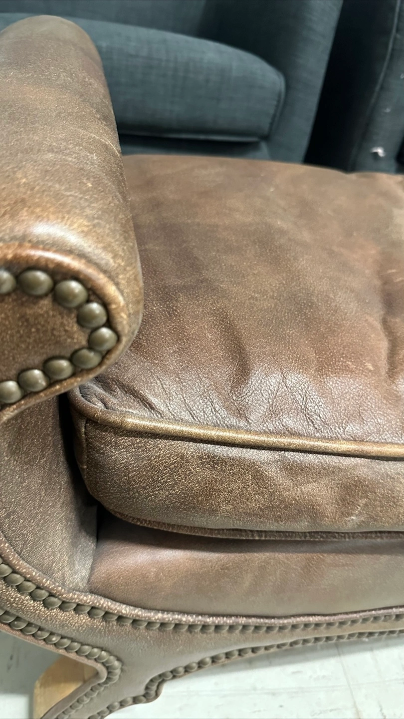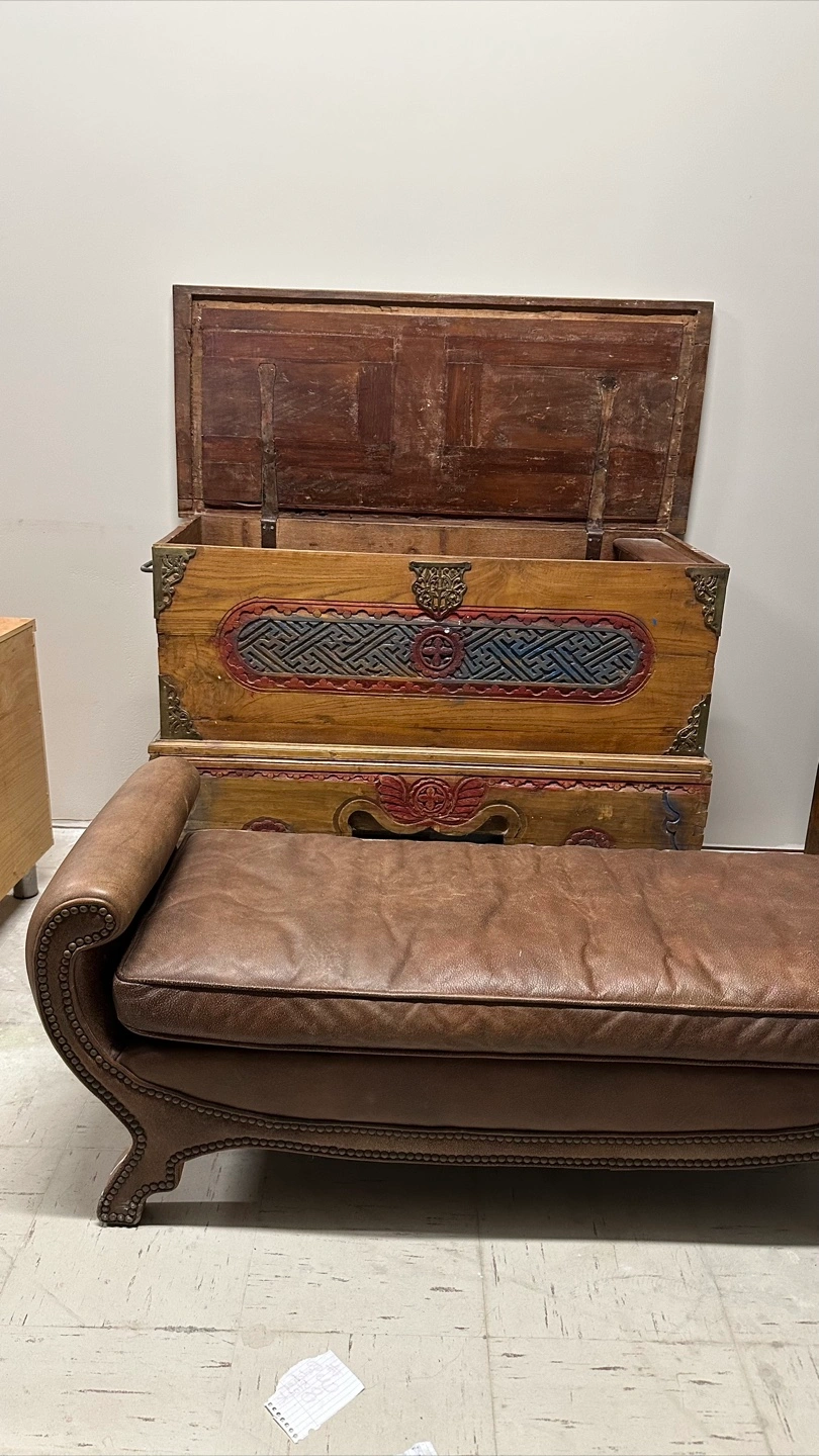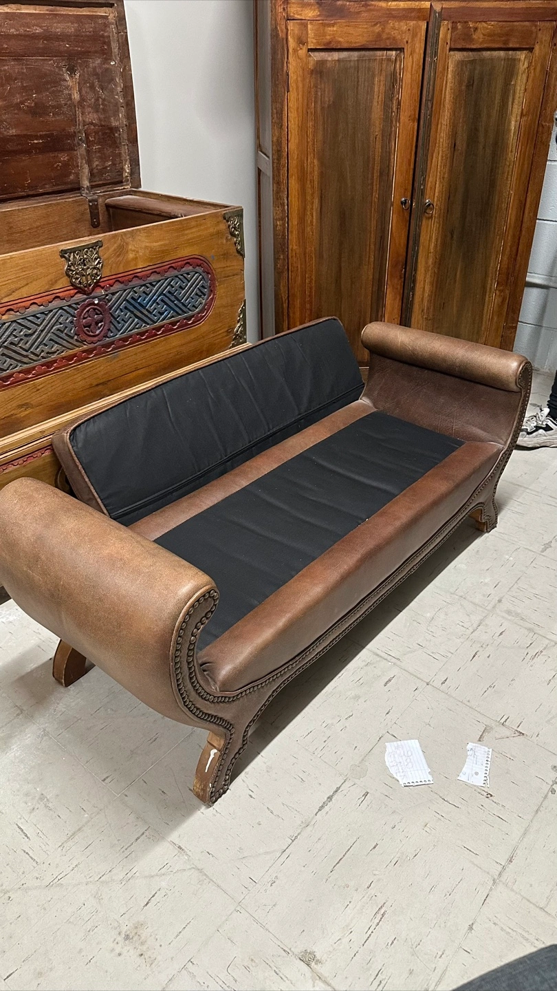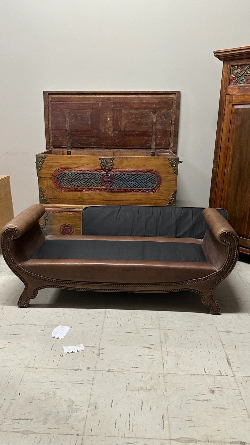 Here's a stylish brown fabric leather ottoman bench. It has a unique design with nailhead trim and curved arms. It would be a great addition to any living room or bedroom! In excellent condition Imported from Bali and frame is solid wood 52” wide 19 depth 20 height Pick up in the downtown area Cash only