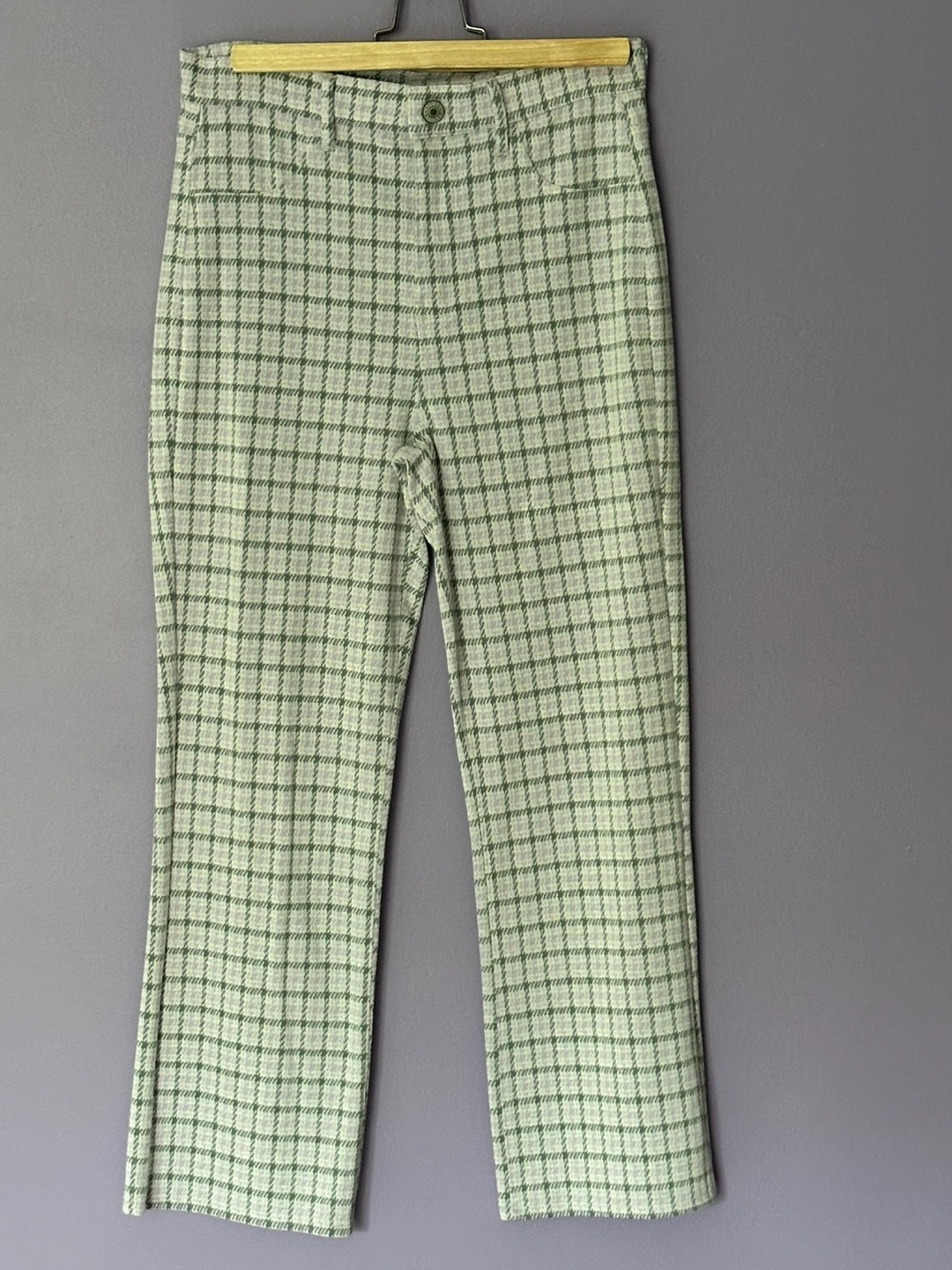 Cute pair of plaid trousers! They feature a purple and white checkered pattern. Perfect for a casual or dressed-up look