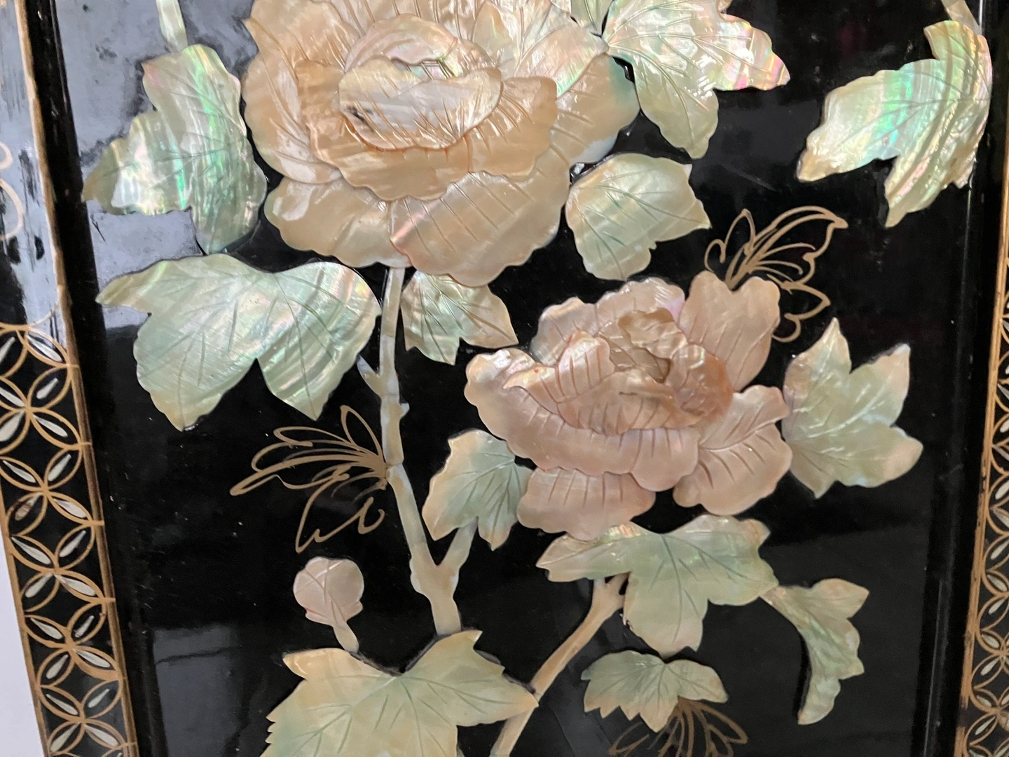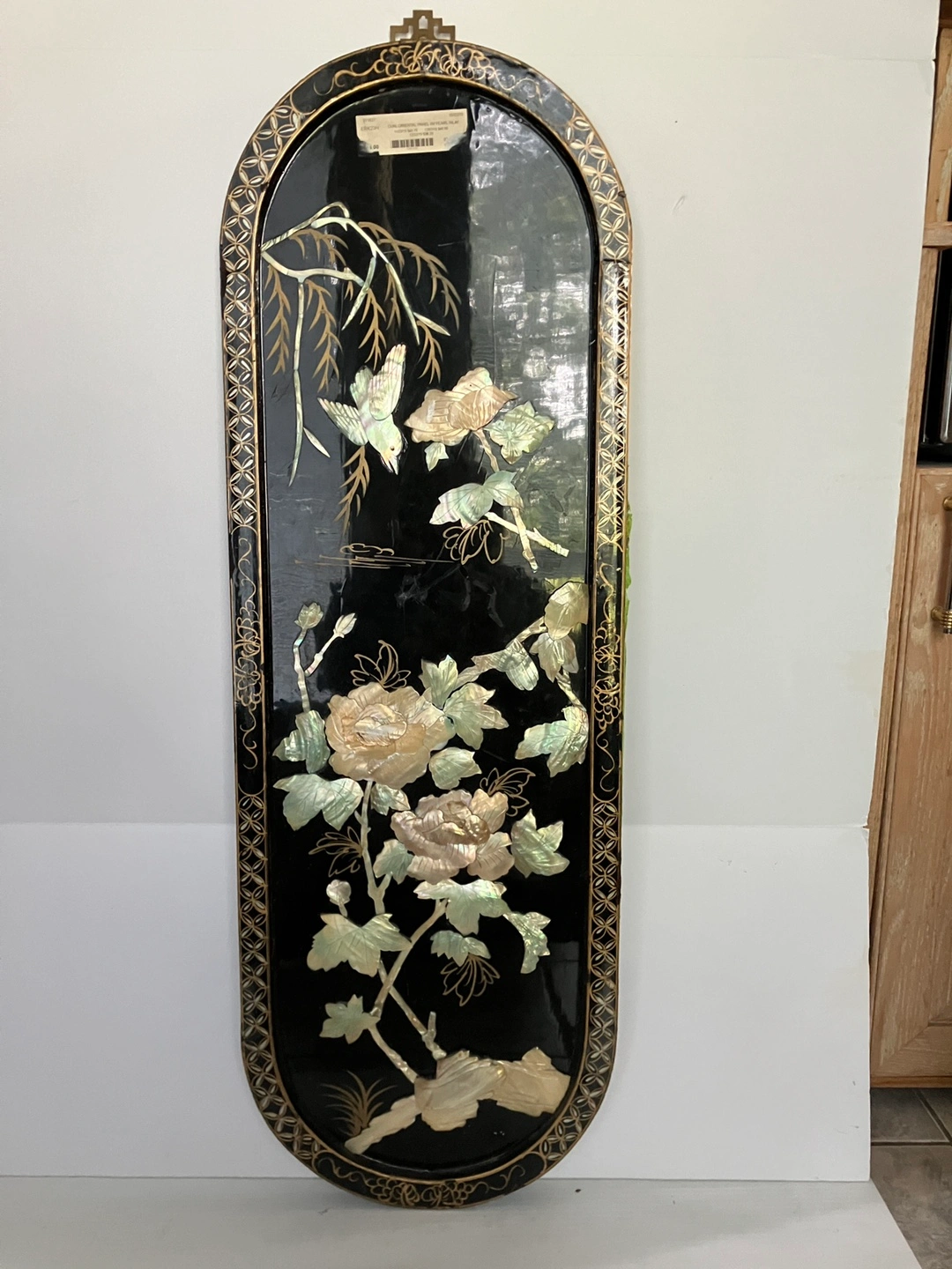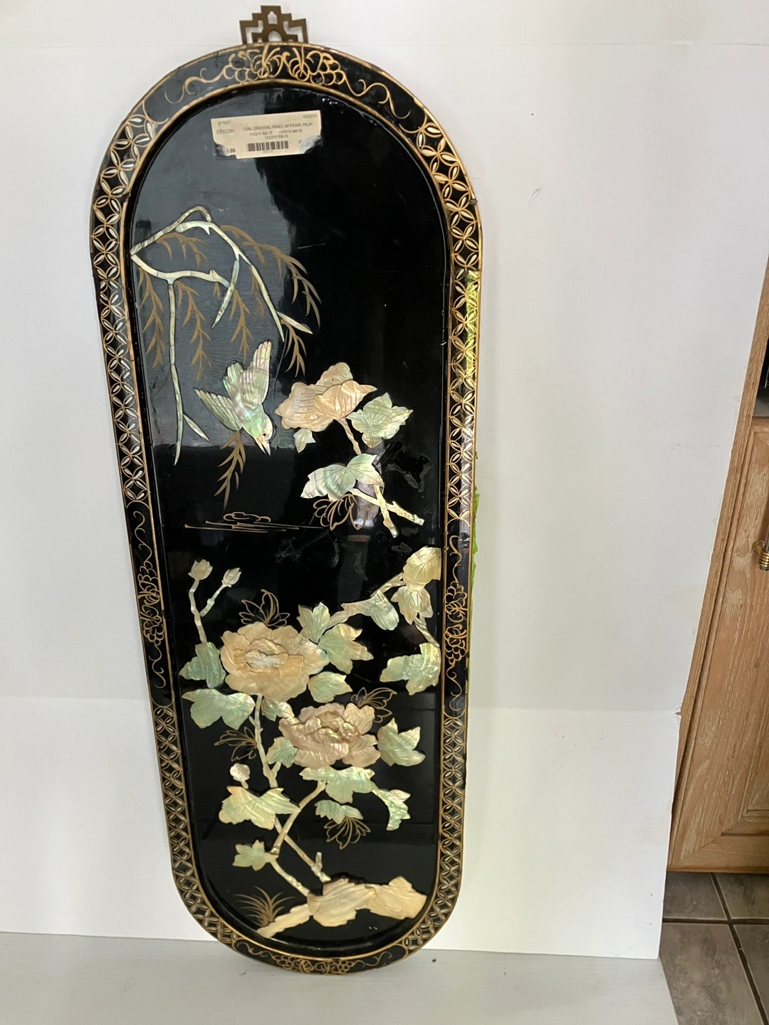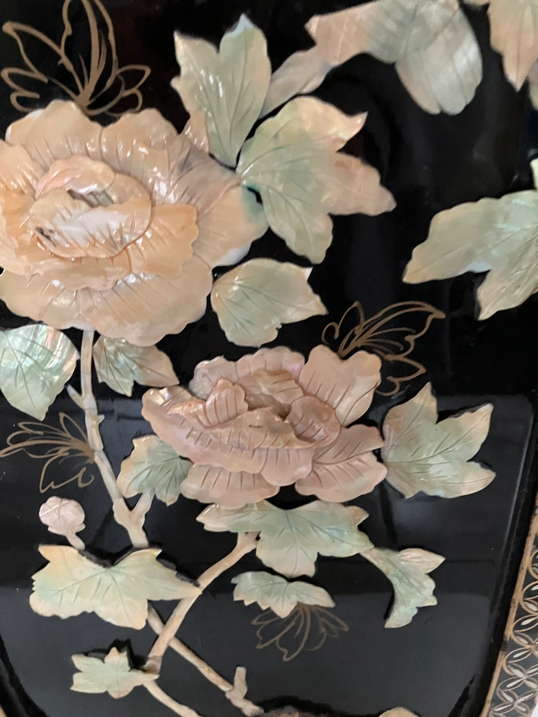 Exquisite vintage oval. Chinese black lacquered panel with mother of pearl intricate raised design
