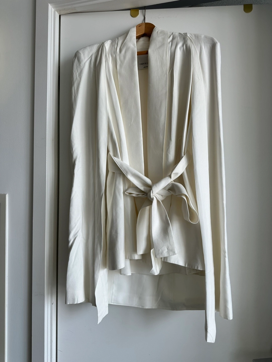 584Here's a stylish cape from C/MEO Collective. It's a beautiful white colour and made from 100% viscose for the main fabric and 100% polyester for the lining. It's a size small to medium as it comes with a belt. Excellent condition, ready to add a touch of elegance to your wardrobe.