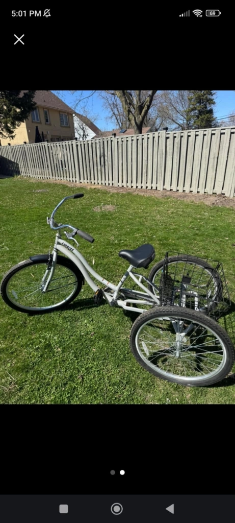 Selling a silver adult tricycle, perfect for leisurely rides around the neighbourhood. It's an Express trike and has a handy basket in the back for carrying groceries or other items. Great for anyone looking for a stable and comfortable ride!
