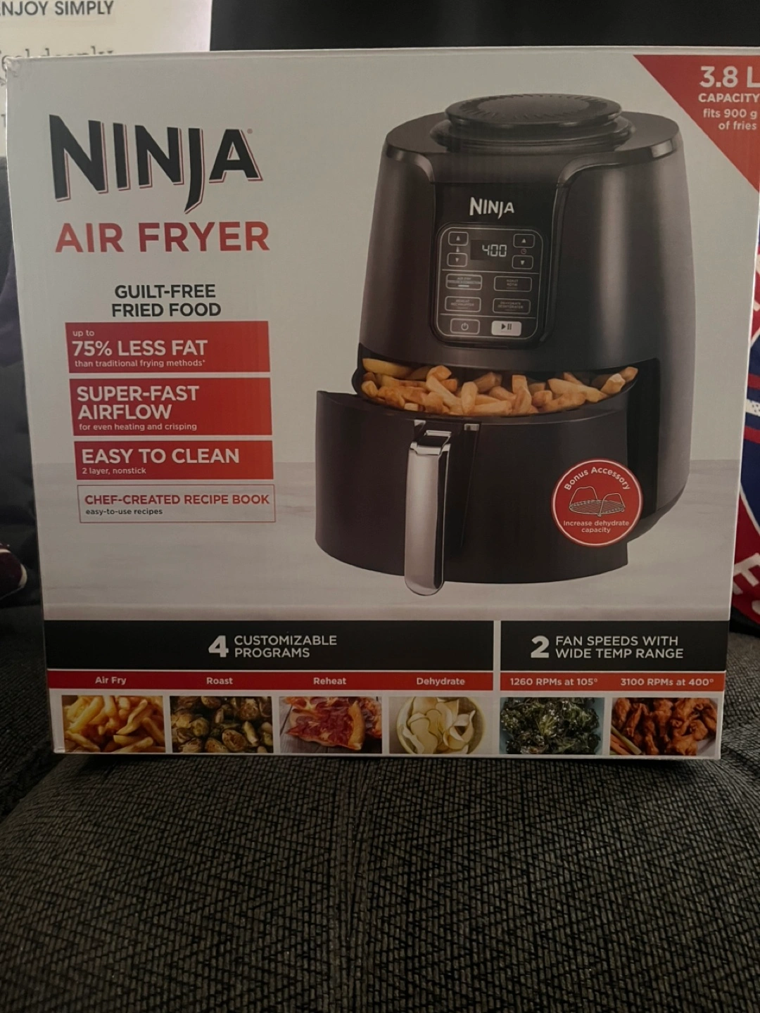 Get ready to enjoy guilt-free fried food with this Ninja Air Fryer! It uses super-fast airflow for even heating and crisping, so you can enjoy your favourite foods with up to 75% less fat than traditional frying methods. Plus, it's easy to clean with its 2-layer, nonstick basket. It has 4 customizable programs: Air Fry, Roast, Reheat, and Dehydrate. The air fryer has a 3.8 L capacity, fitting 900g of fries. It also has 2 fan speeds with a wide temp range.