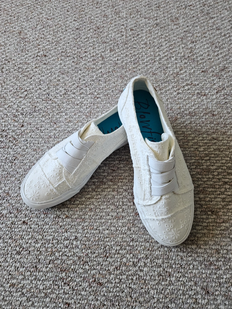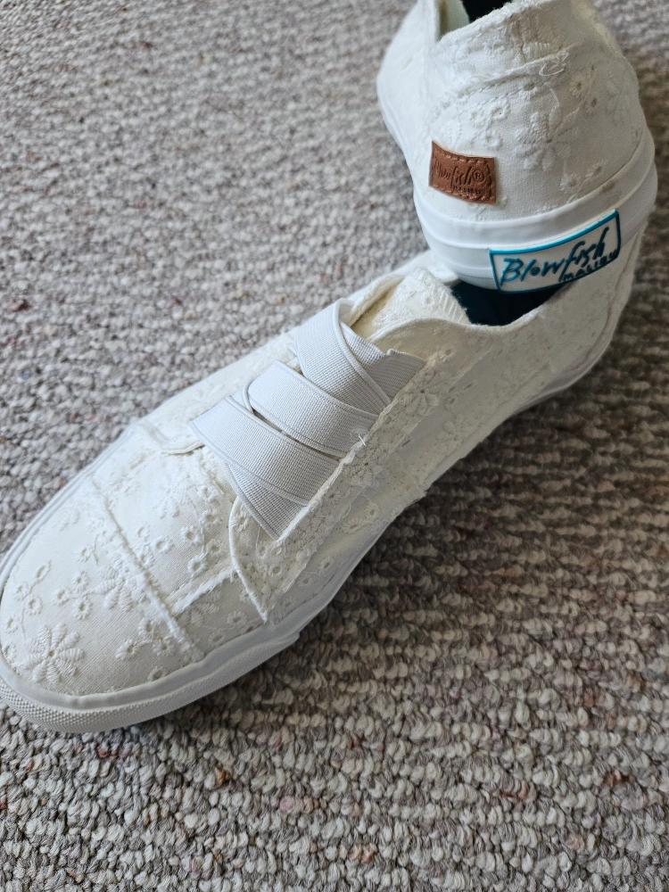 355Selling a pair of Blowfish Malibu women's slip-on shoes! They're a lovely white colour and in great condition. Size 7
