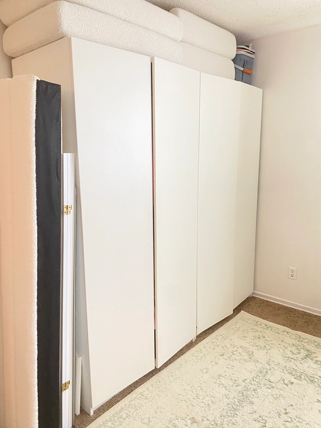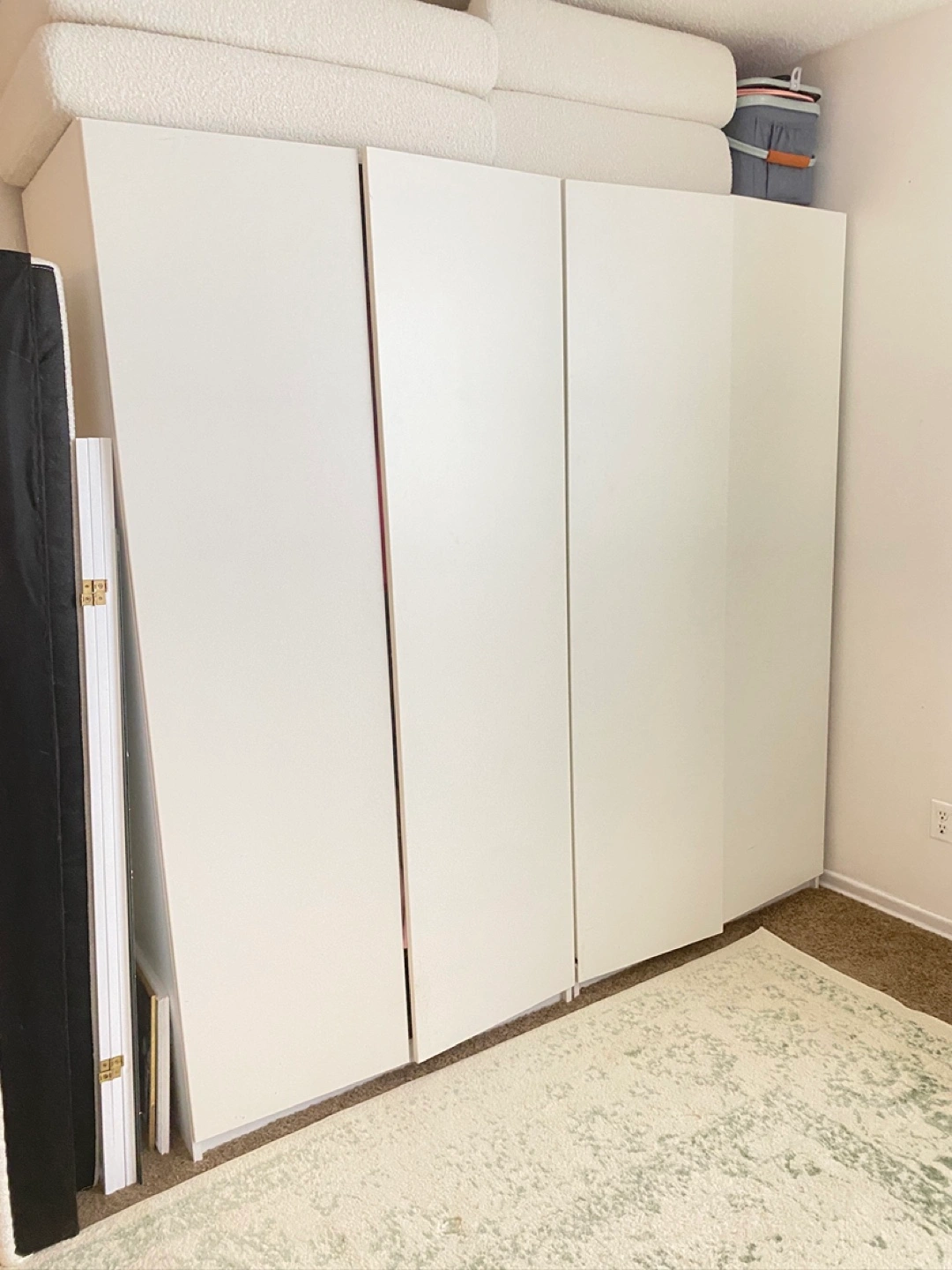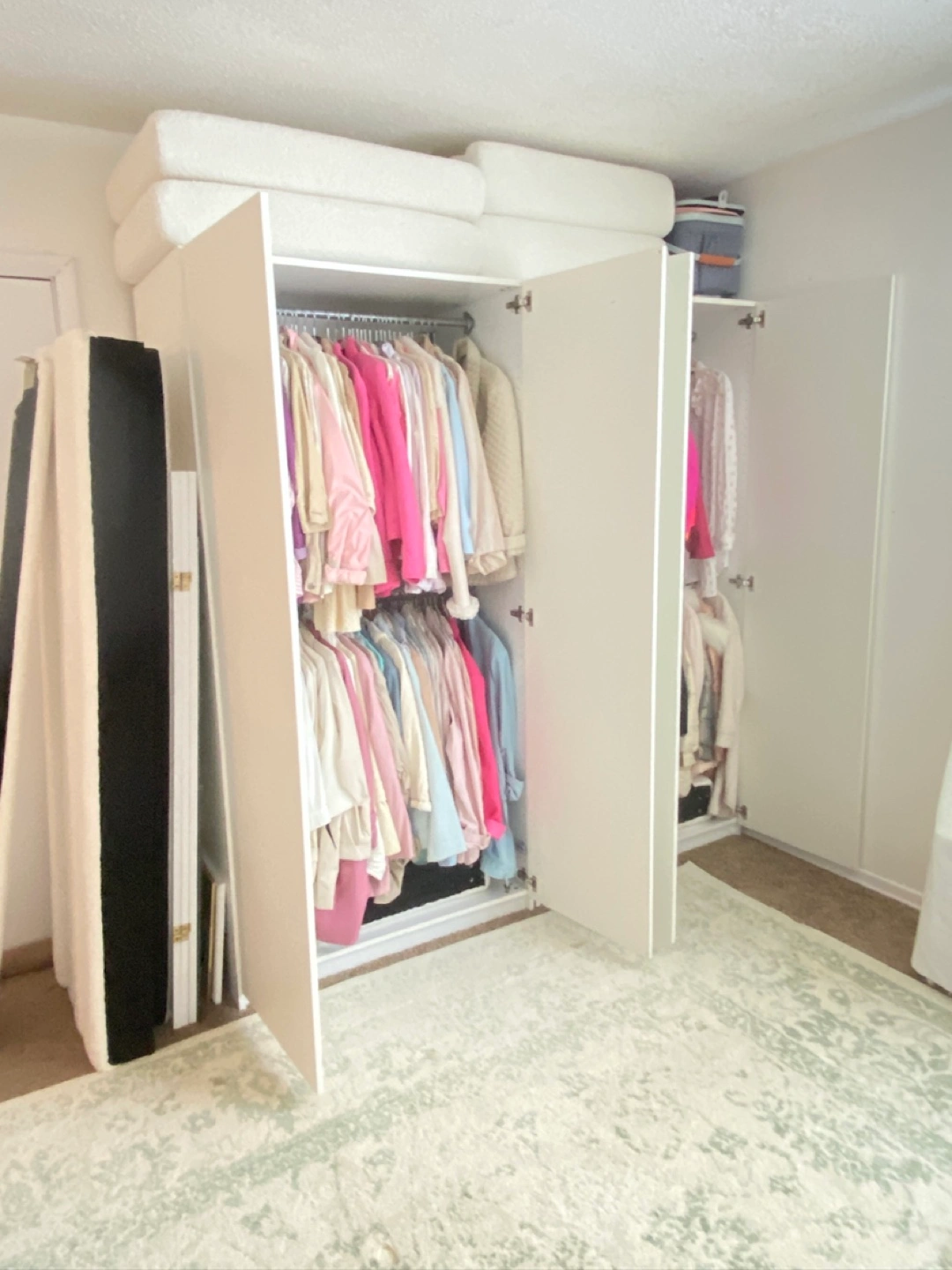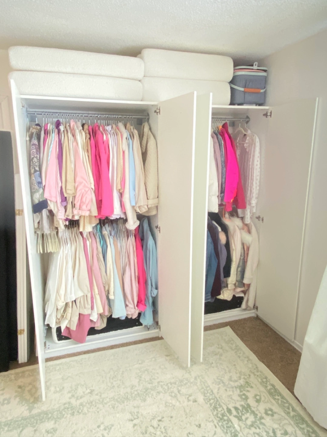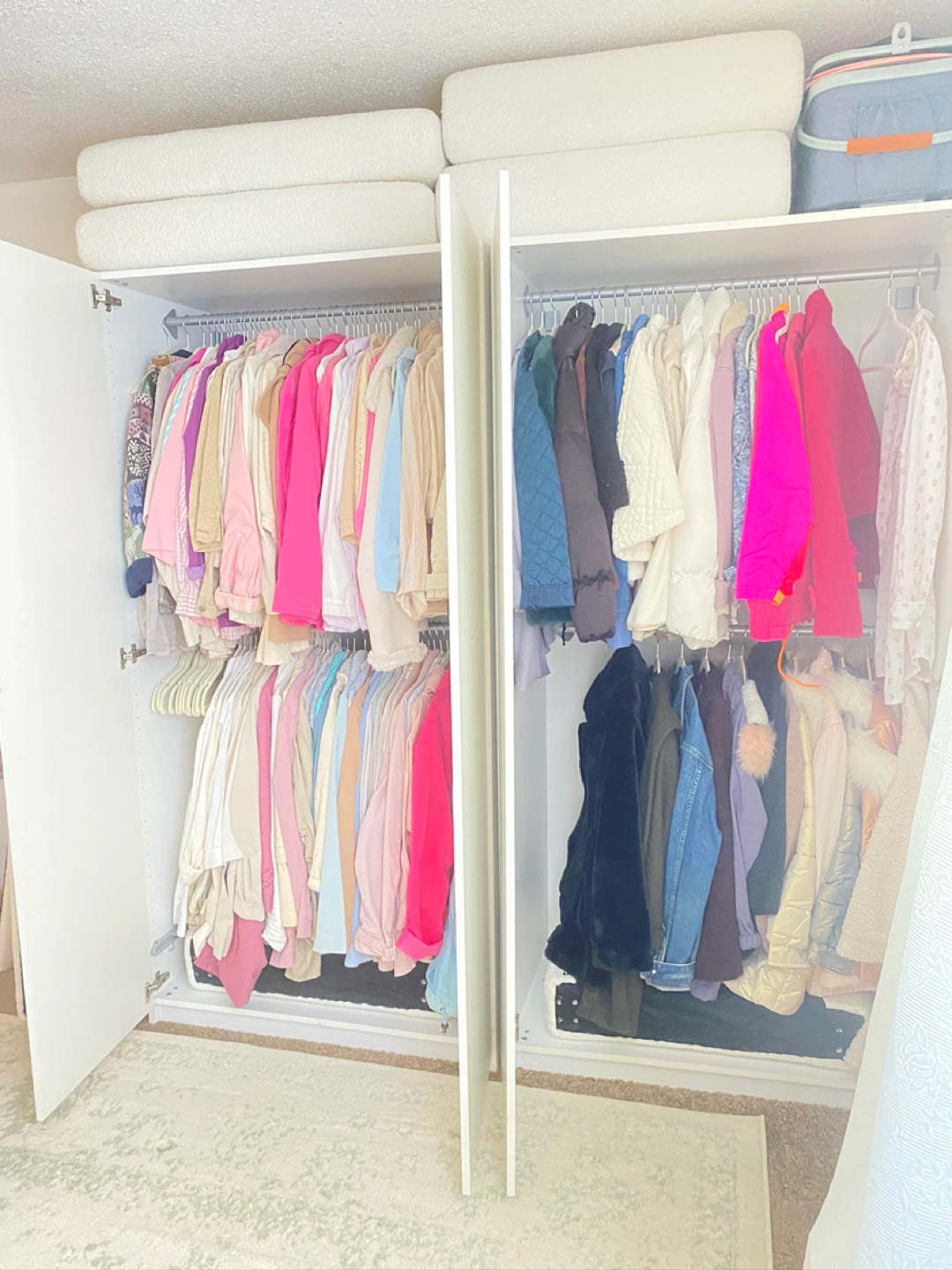 2 large free standing closets with double doors and 2 levels of strong sturdy hanging rods. Very sturdy and strong can HOLD A LOT of heavy coats and clothes.