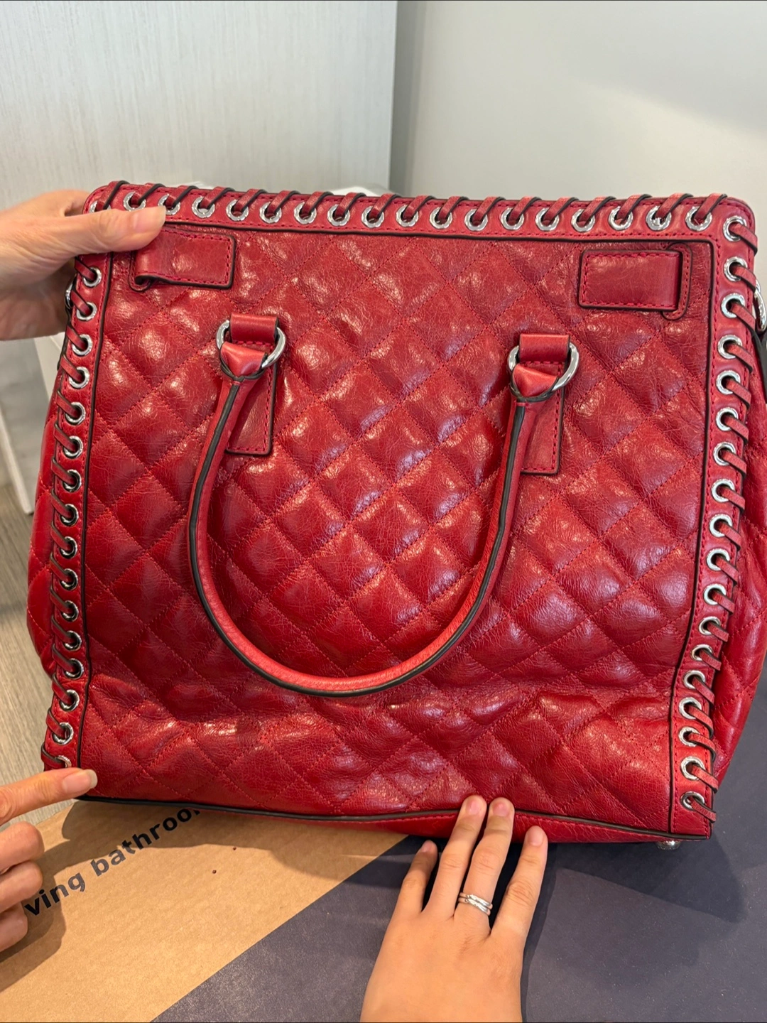 Selling a Michael Kors tote bag in a lovely red quilted leather! It's in great condition and ready for a new home. Perfect for everyday use or a special occasion. The interior is spacious with several compartments to keep your belongings organized. A stylish and functional bag! Please offer your price!