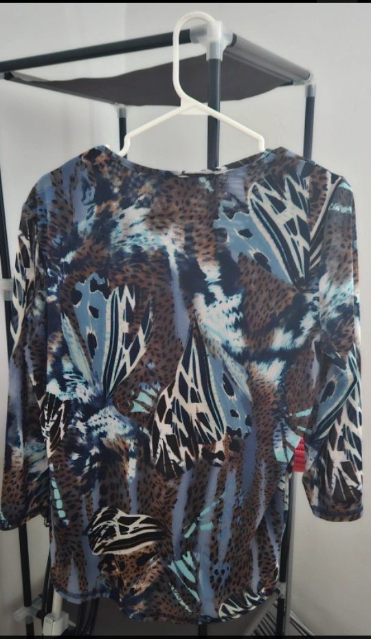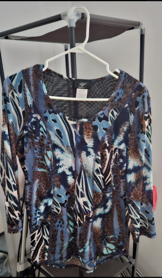 This is a quarter sleeve top with a unique pattern. It has a scoop neck and is in great condition! Perfect for adding a touch of style to your wardrobe
