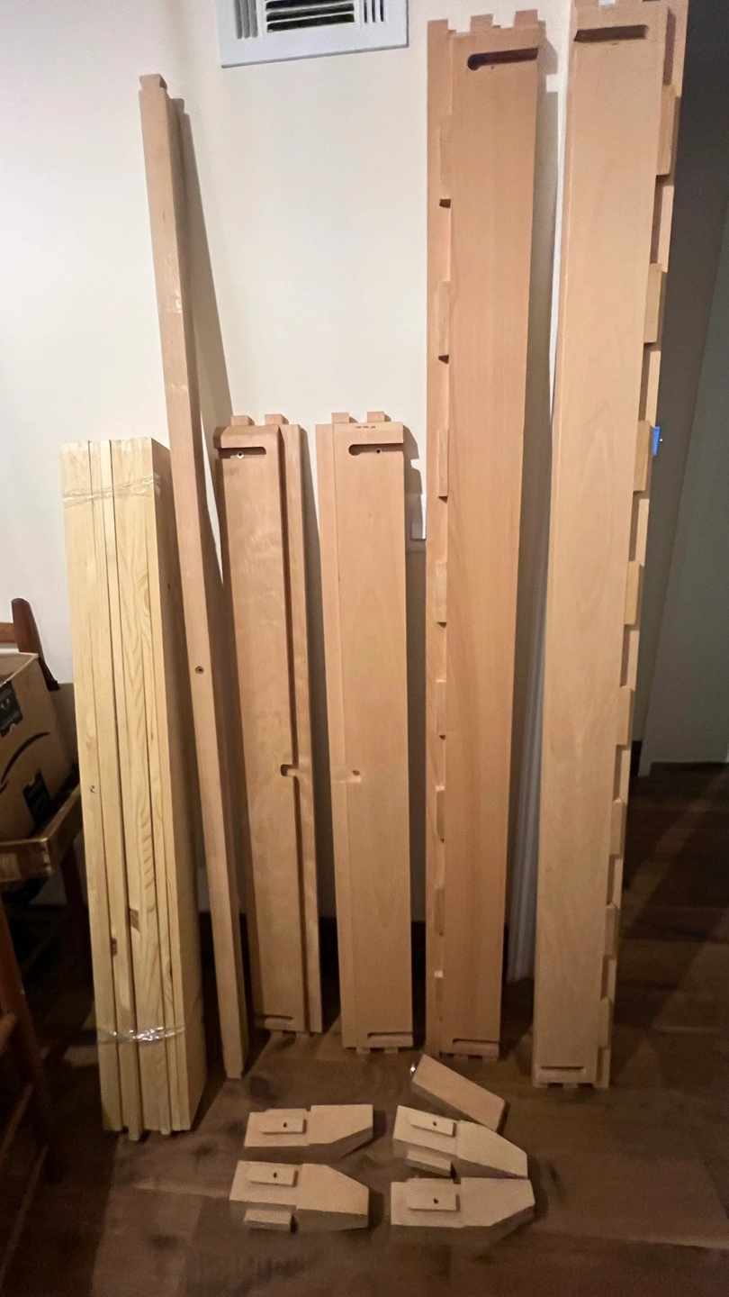 FULL size wooden Japanese joinery style bed frame, disassembled. I don't know the brand but it's similar to Thuma, made of REAL quality lumber. Includes side rails, headboard/footboard pieces, and leg supports. Pick up in Bed Stuy. Super sturdy, just doesn't fit in my new space!