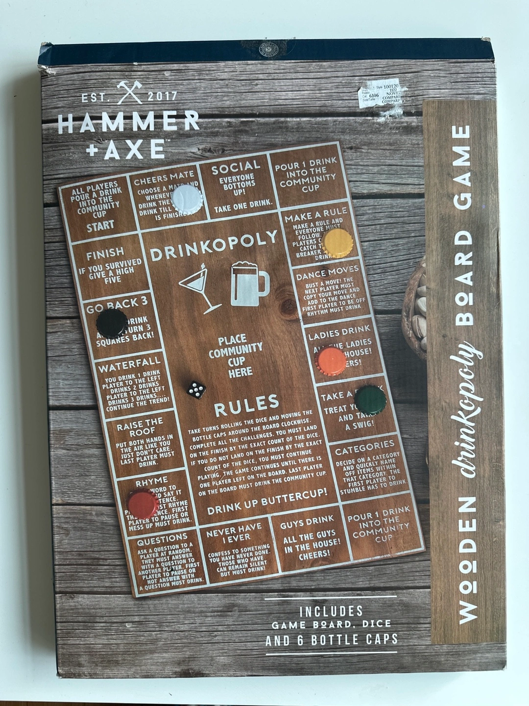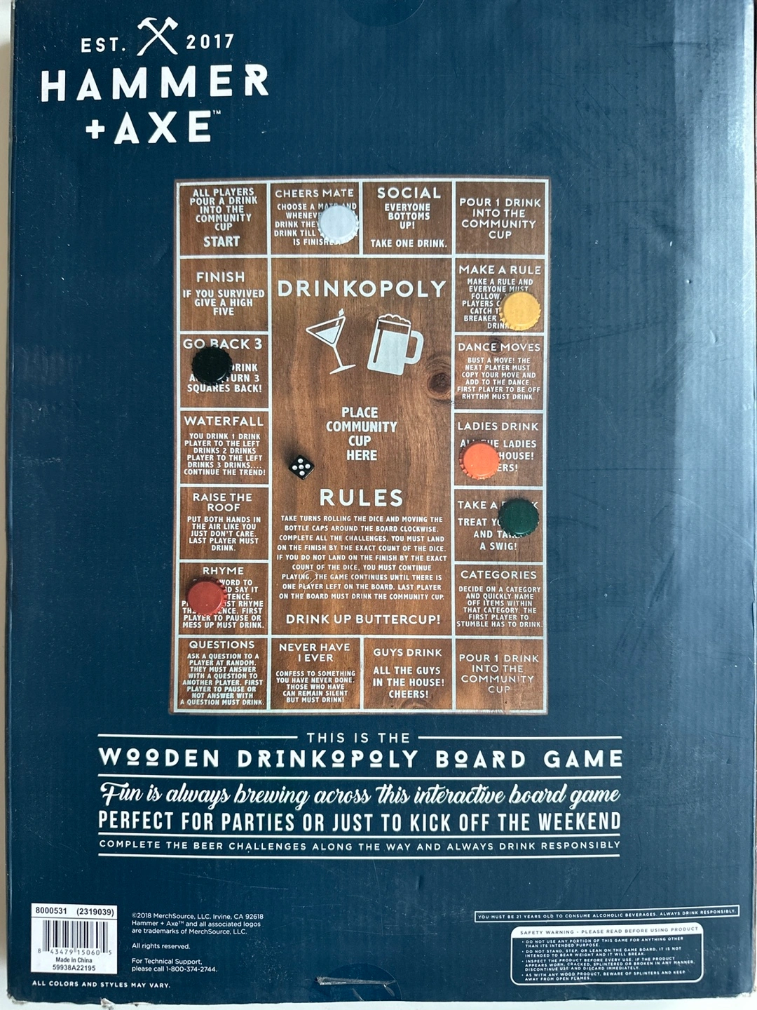 Get ready for some interactive fun with this Hammer + Axe Drinkopoly board game! It includes the game board, dice, and six bottle caps. Perfect for parties or just kicking off the weekend. Cheers!