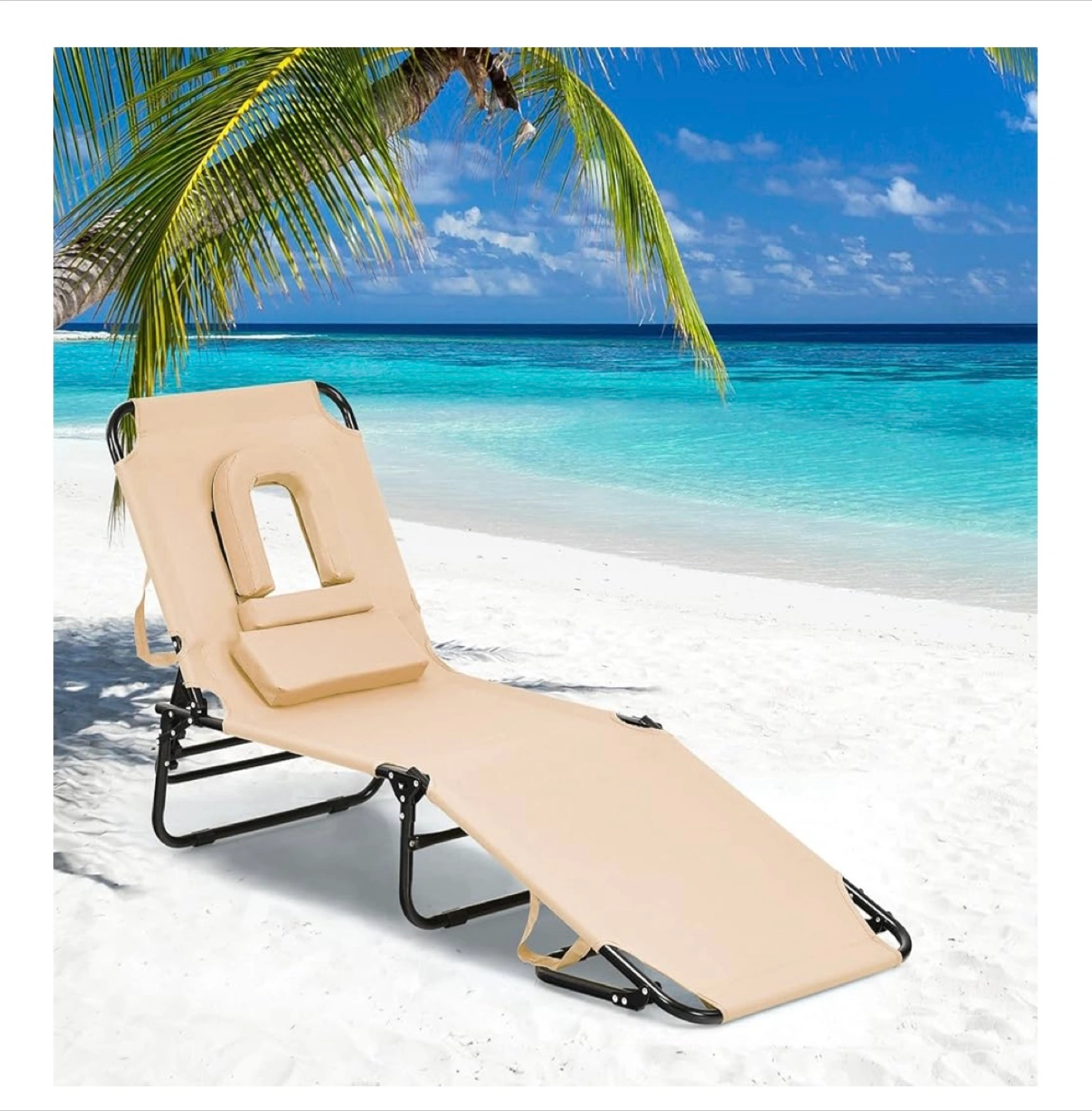 Folding Beach Lounge Chair w/ 5 Adjutable Backrest & Padded Pillow, Sunbathing Lounger Chair, Sun Tanning Lay Flat Chair for Seaside Pool Deck, Max Load 330 LBS, No Assembly Required (Beige)