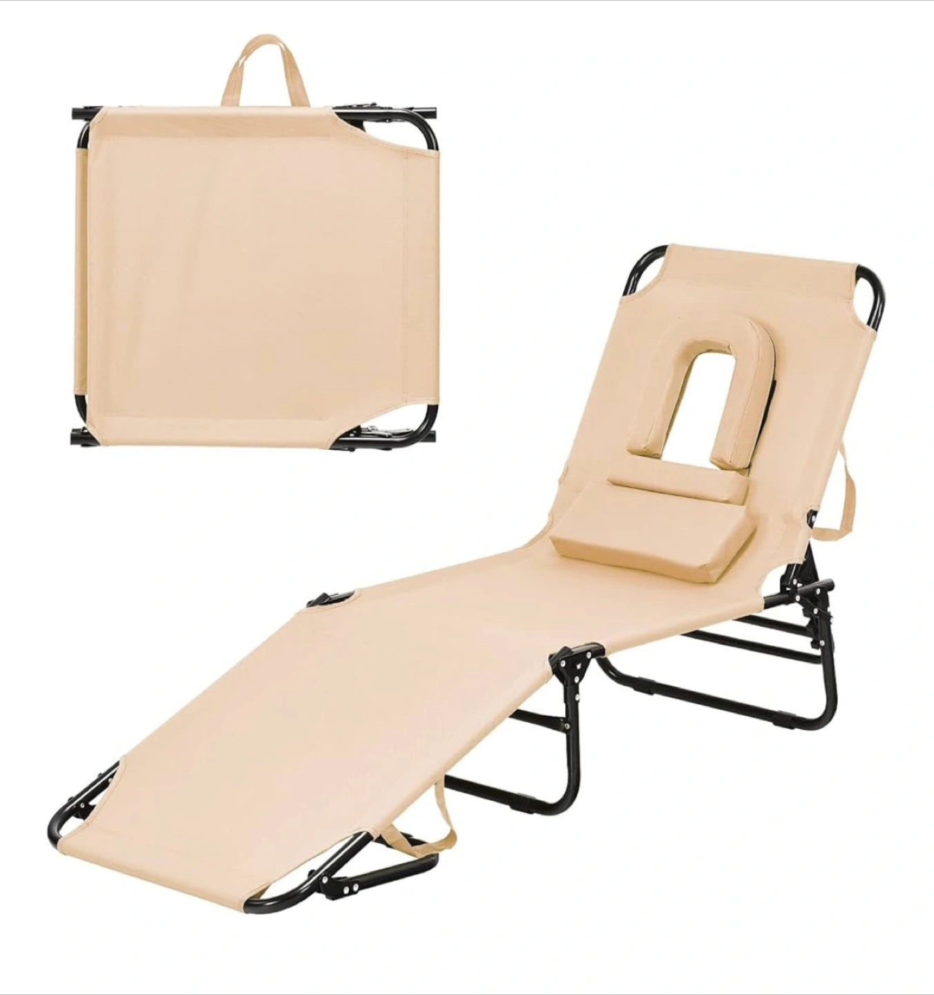 Folding Beach Lounge Chair w/ 5 Adjutable Backrest & Padded Pillow, Sunbathing Lounger Chair, Sun Tanning Lay Flat Chair for Seaside Pool Deck, Max Load 330 LBS, No Assembly Required (Beige)