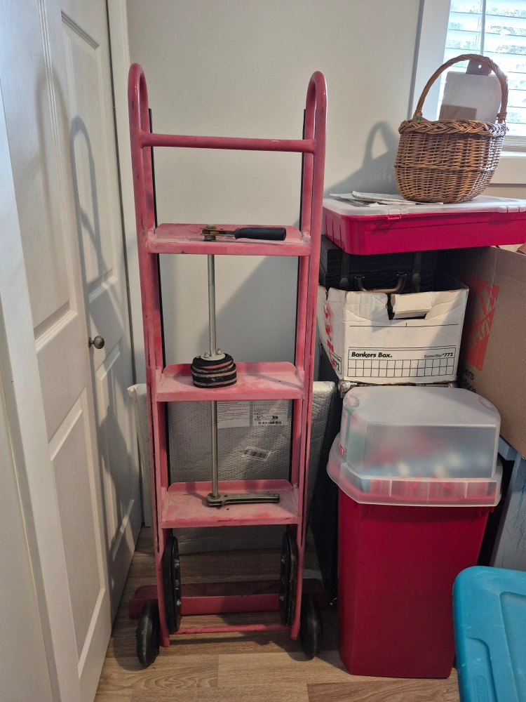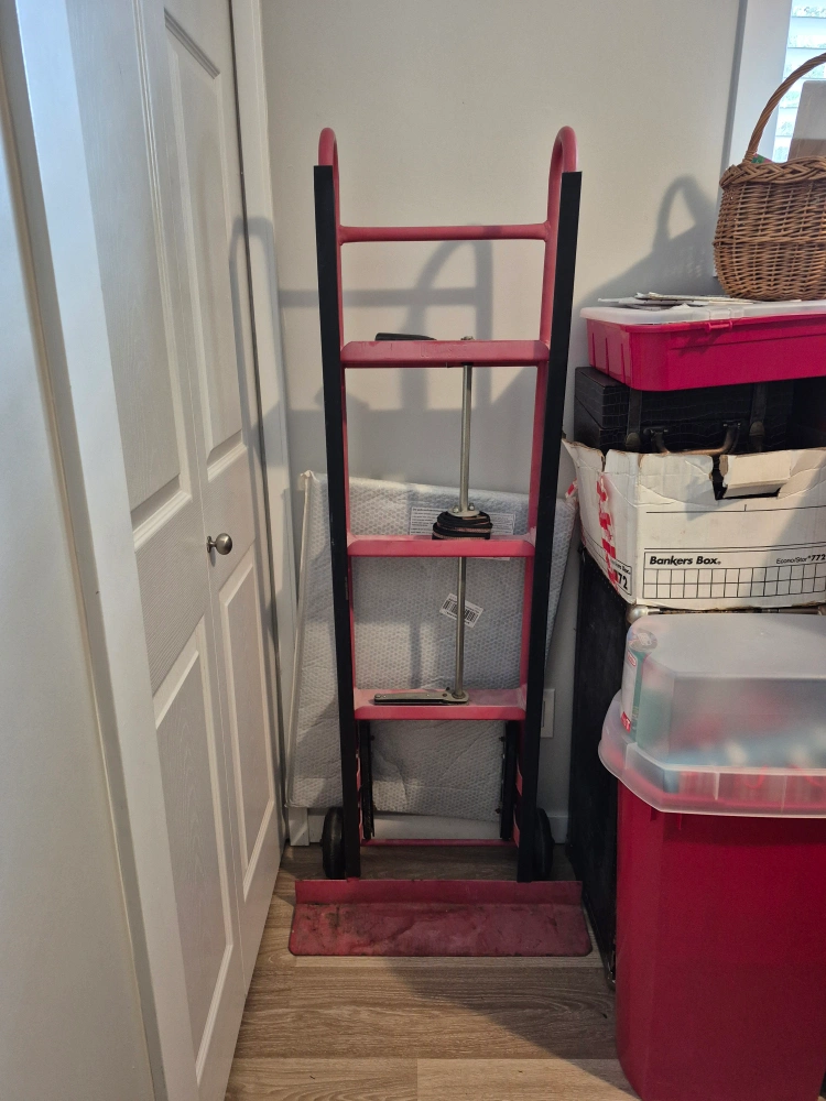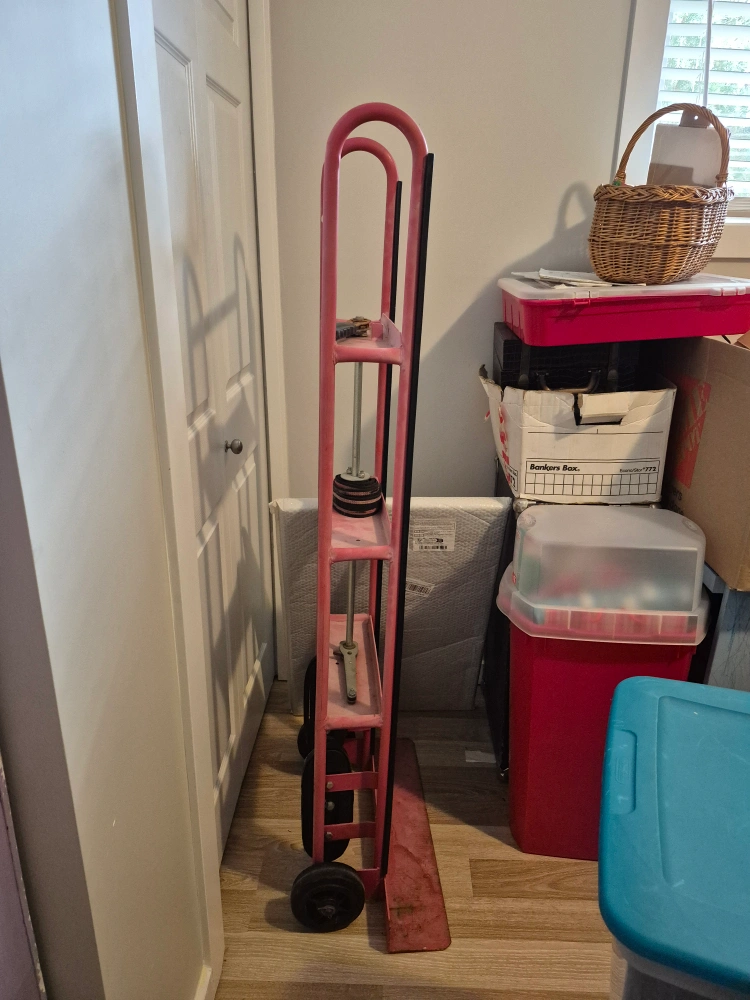 Selling a pink hand truck dolly. It is used and shows some wear, but still works great for moving heavy items. Perfect for moving boxes or furniture!