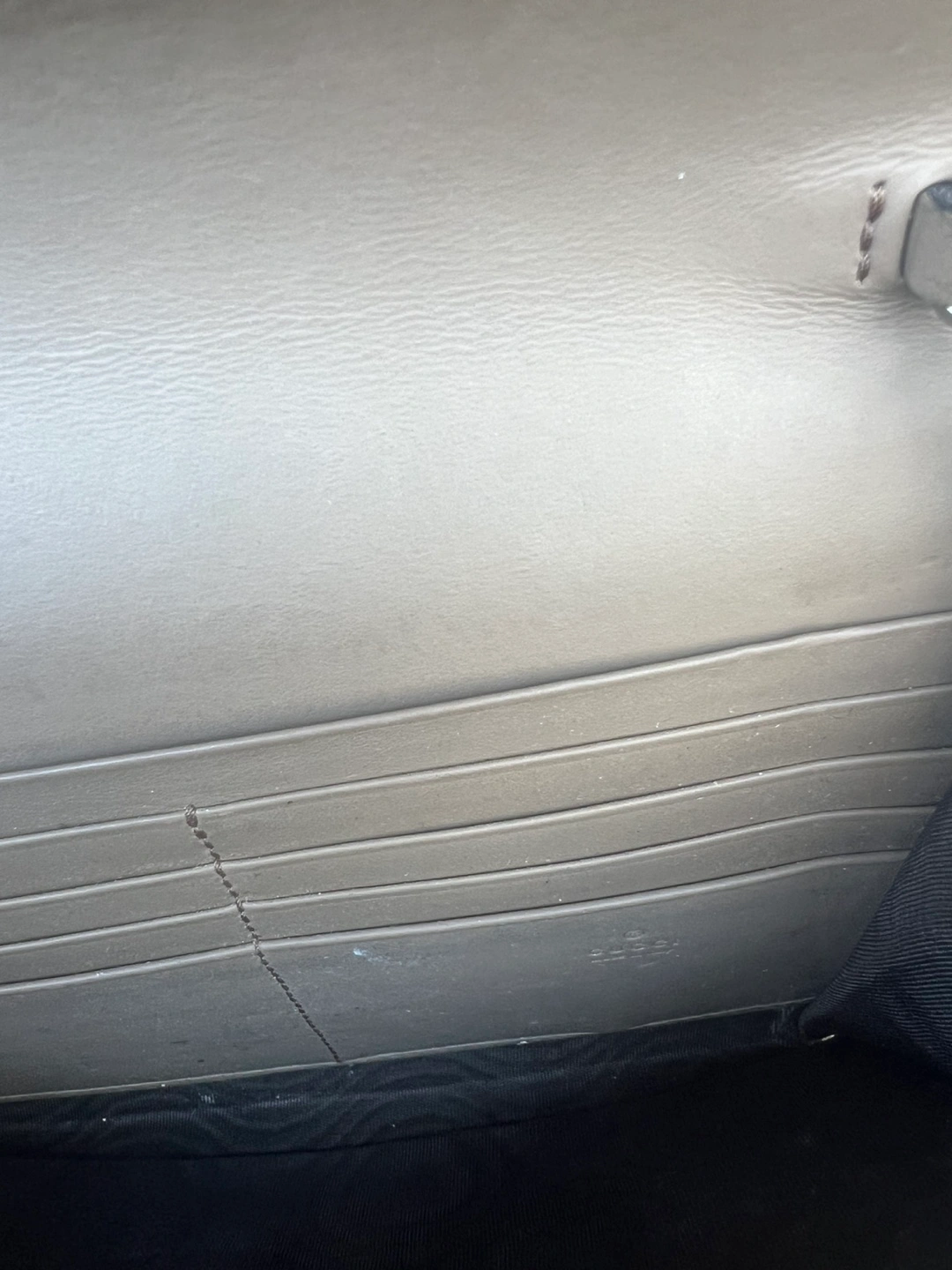 There is light wear on the suede corners where the chain attaches, consistent with occasional use. One barely noticeable, pinpoint-sized nail polish mark is present on the front, but otherwise the wallet is in excellent condition. Interior is clean and fully functional, with no tears or stains.