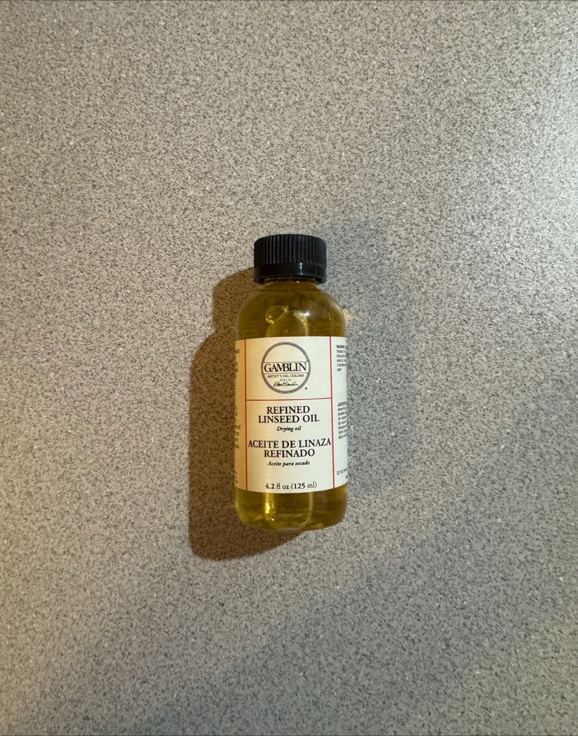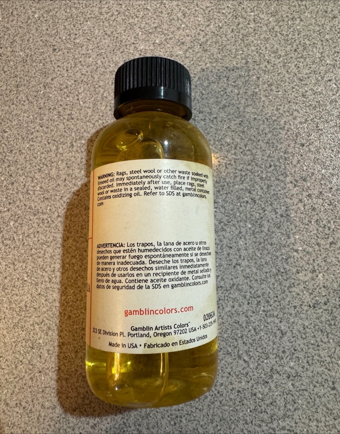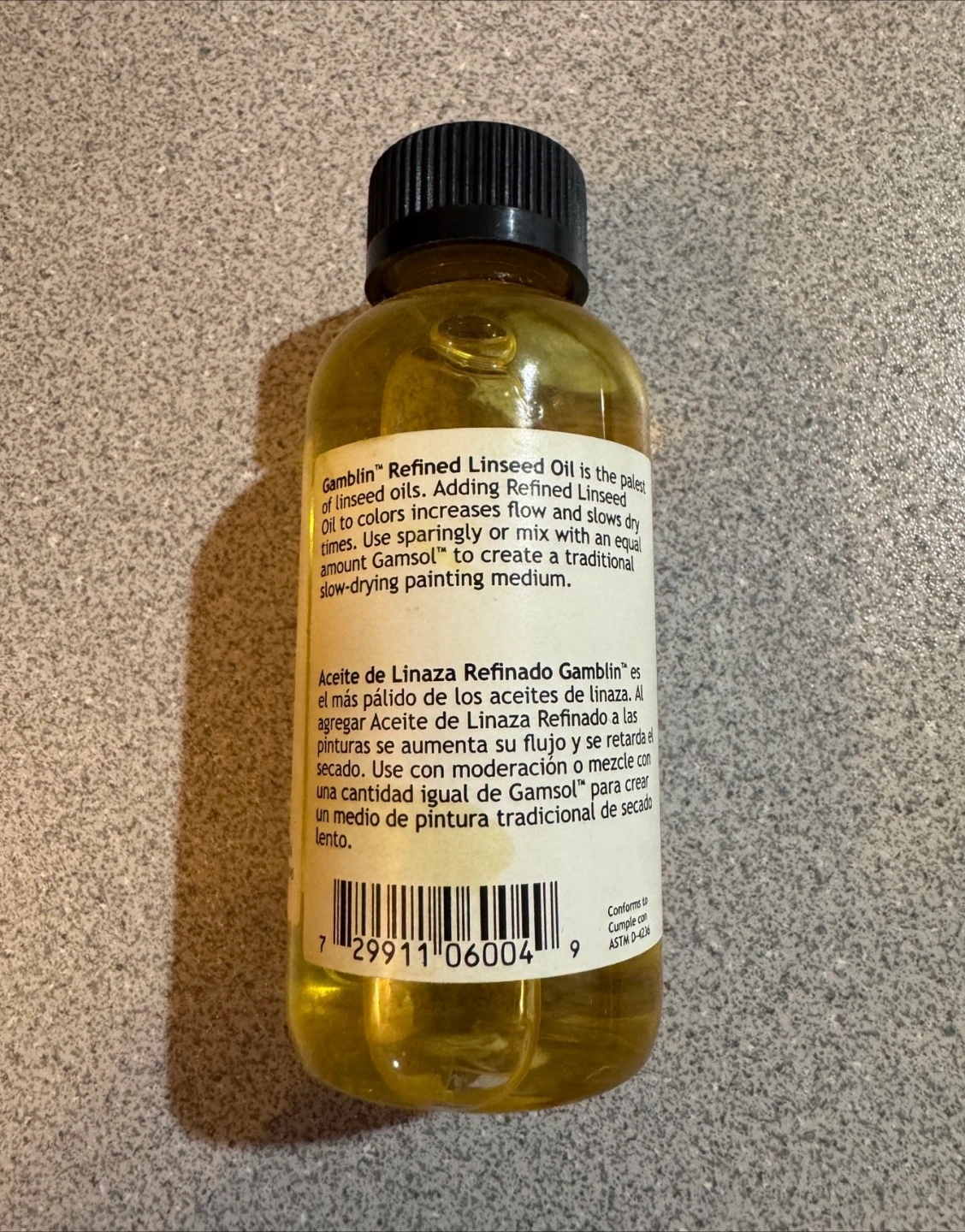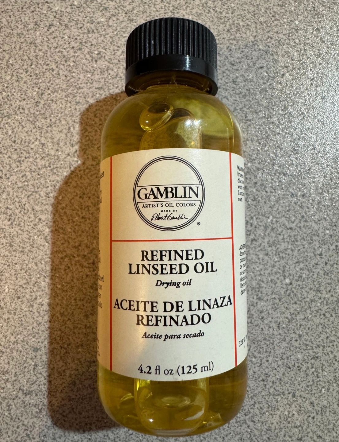 Selling a bottle of Gamblin Refined Linseed Oil. It's 4.2 fl oz (125 ml). This oil is the palest of linseed oils and allows dry times. Use sparingly or mix with an equal amount of Gamsol to create a traditional slow-drying painting medium