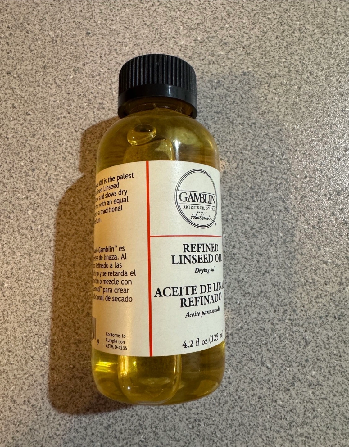 Selling a bottle of Gamblin Refined Linseed Oil. It's 4.2 fl oz (125 ml). This oil is the palest of linseed oils and allows dry times. Use sparingly or mix with an equal amount of Gamsol to create a traditional slow-drying painting medium