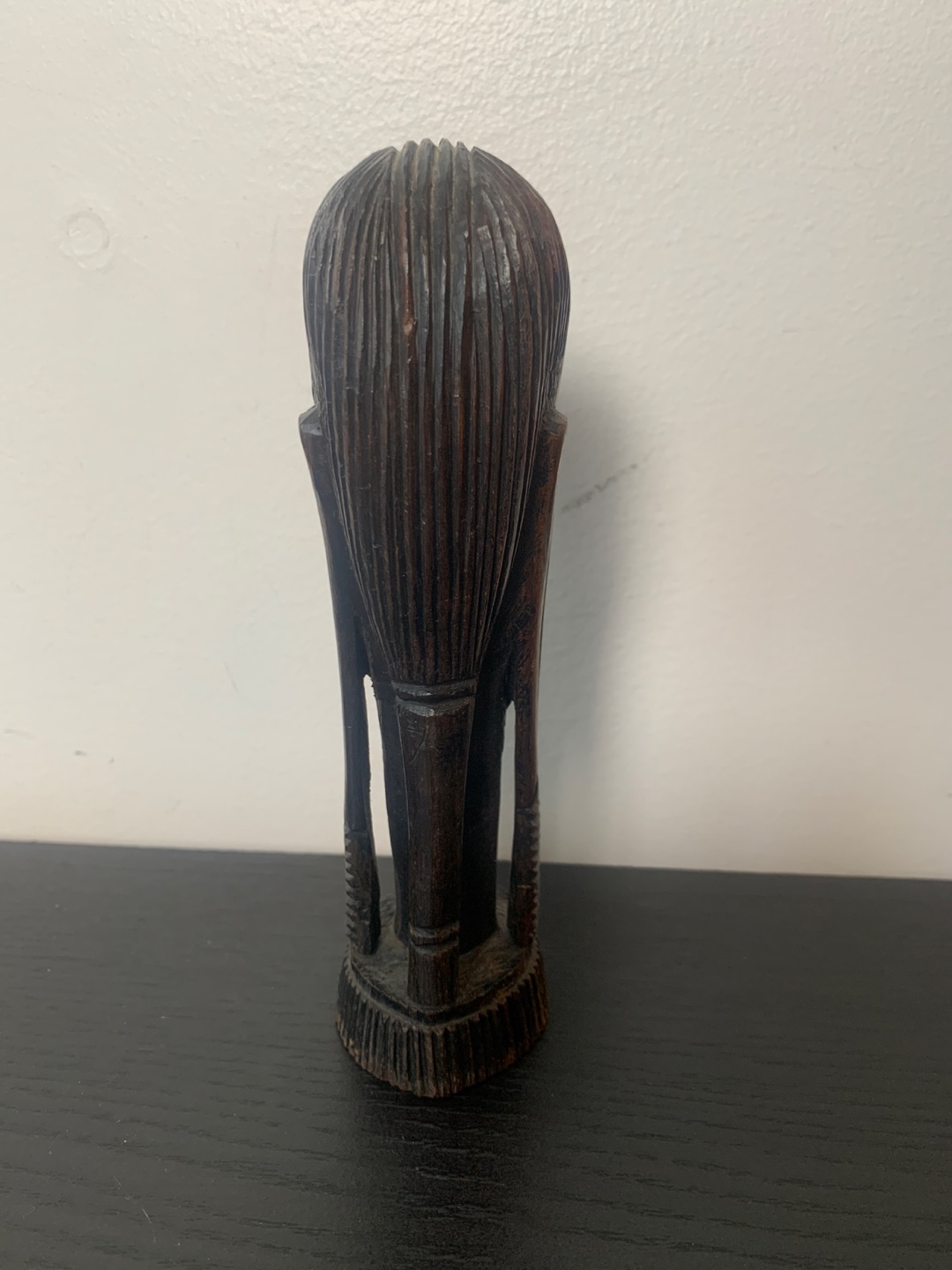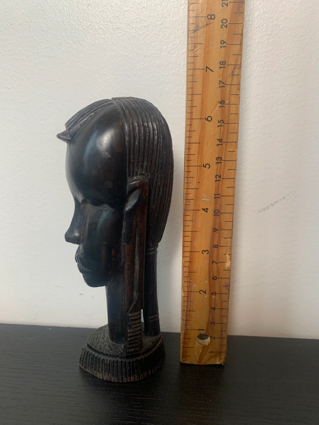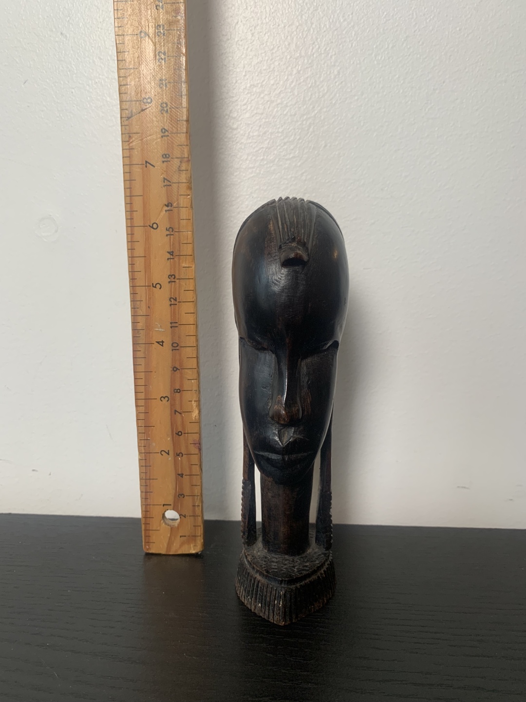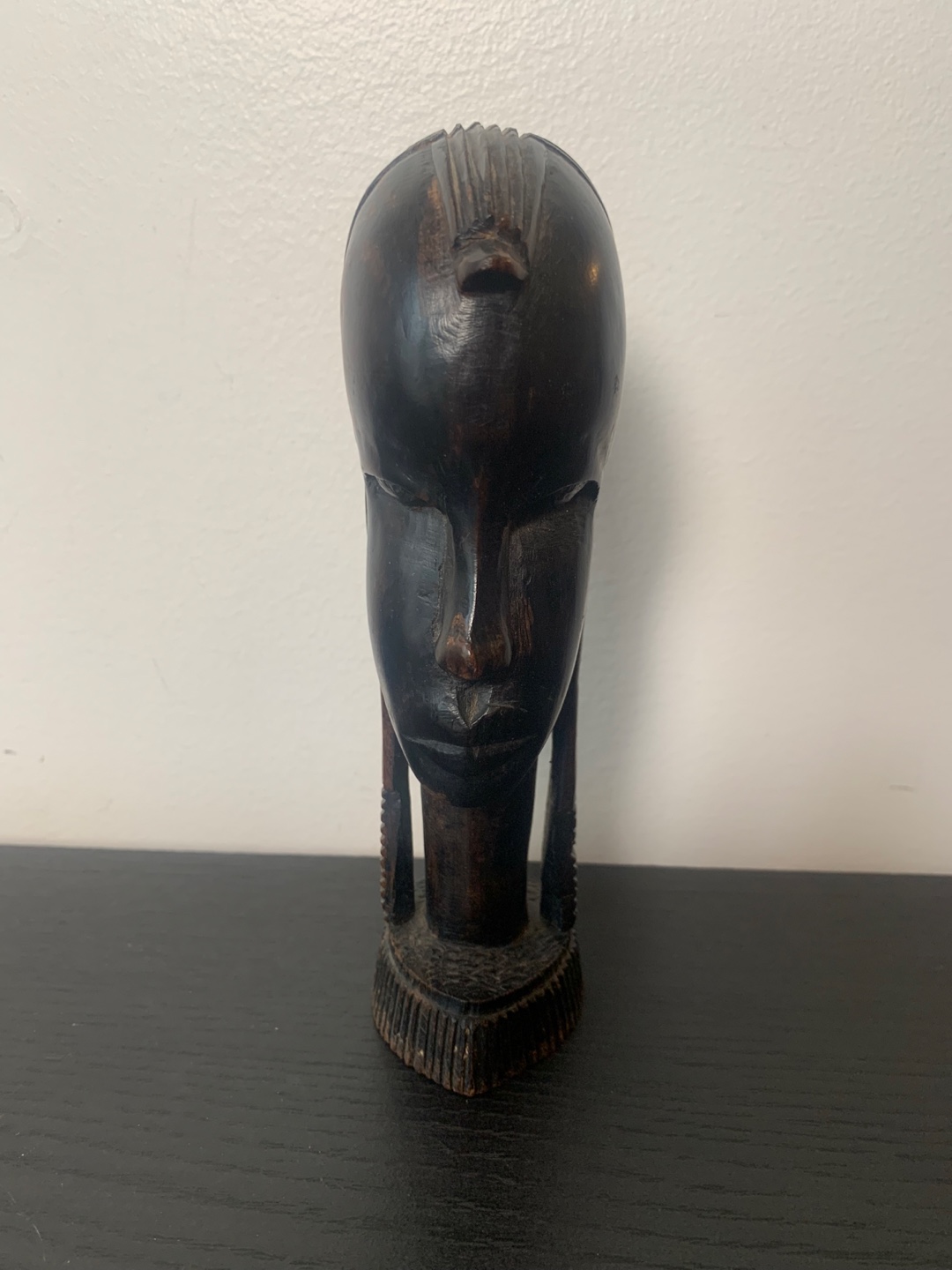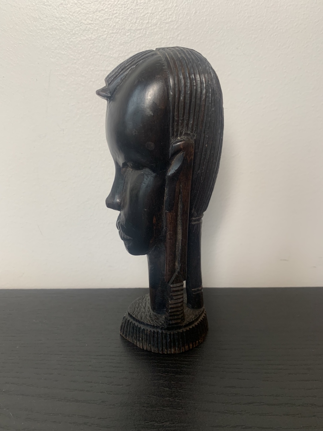 This is a vintage wooden sculpture of an African Masai warrior head from the 70’s or 80’s. it’s a unique piece of art that would look great in any home. It’s 6.5 inches tall and feels very solid. It’s in very good condition.