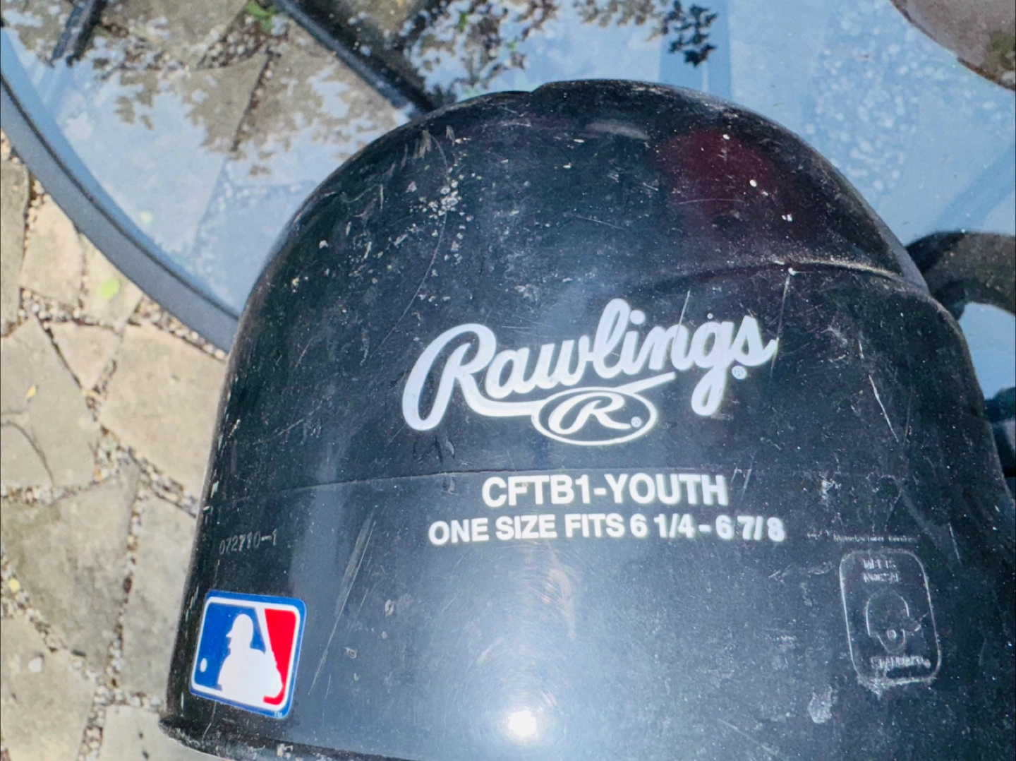 Selling a Rawlings baseball helmet, model CFTB1-Youth. It's black and one size fits 6 1/4 - 6 7/8. It has some wear and tear, but still has lots of life left!