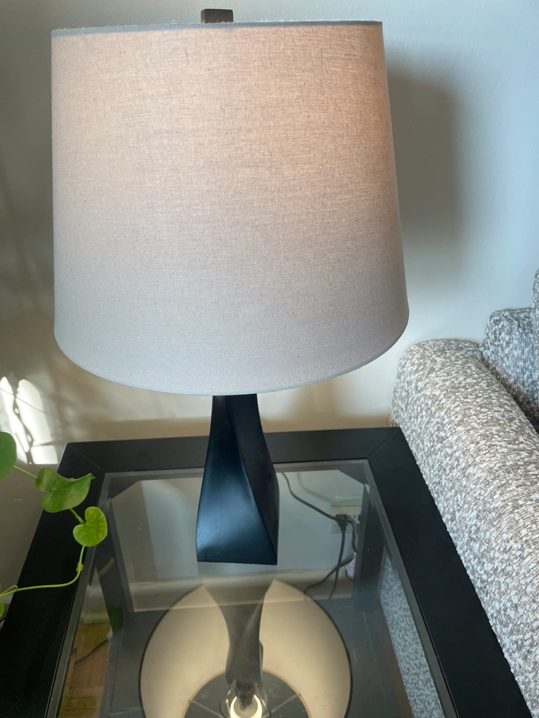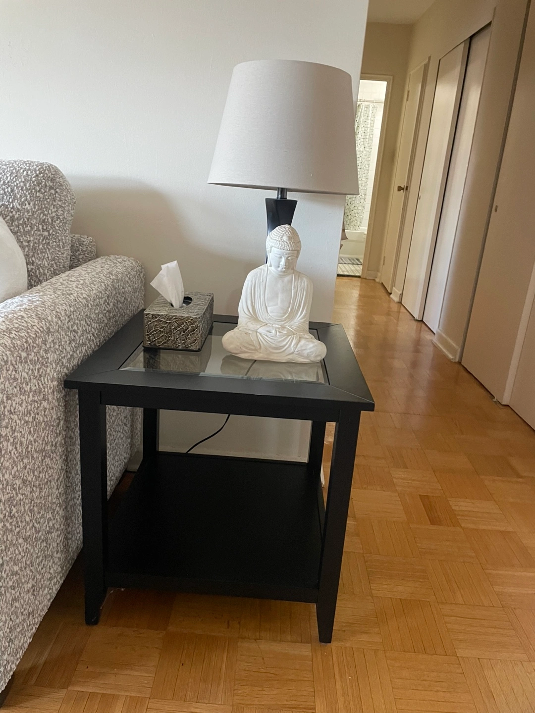 Selling a black end table with a glass top. It has a simple, modern design and is in great condition. Perfect for a living room or bedroom!
