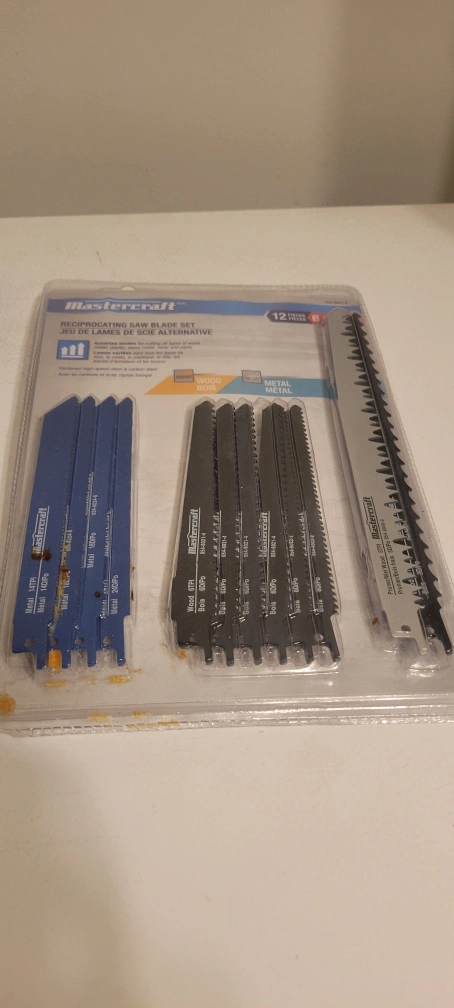 Selling a Mastercraft reciprocating saw blade set. It has 12 pieces and includes blades for cutting all types of metal and wood.