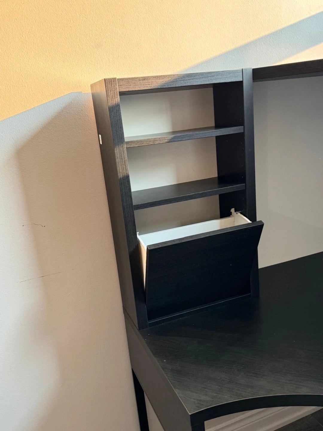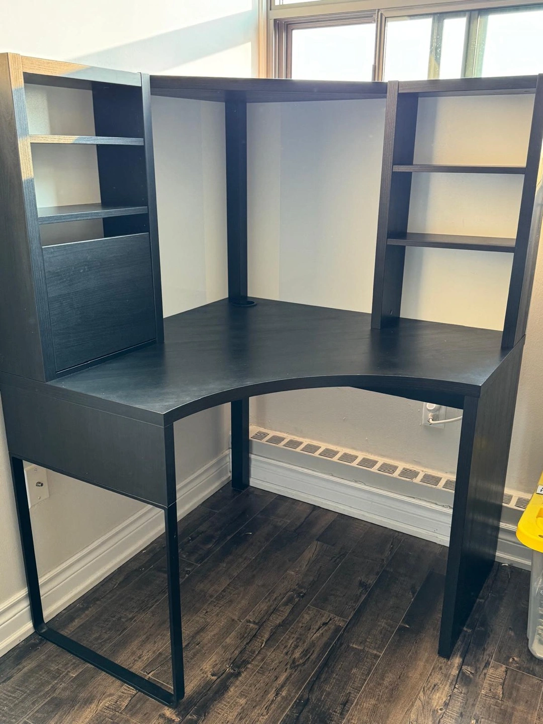 Selling a gently used IKEA MICKE corner workstation desk in black-brown! It's in great shape and perfect for a home office or student setup. This desk offers a spacious work surface and integrated storage to keep your space organized. It's a great piece to maximize corner space!