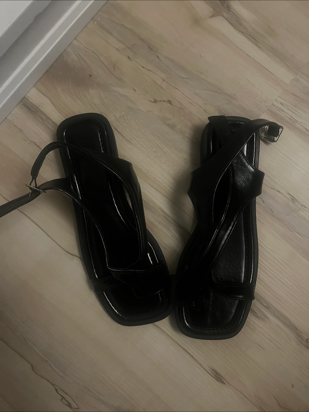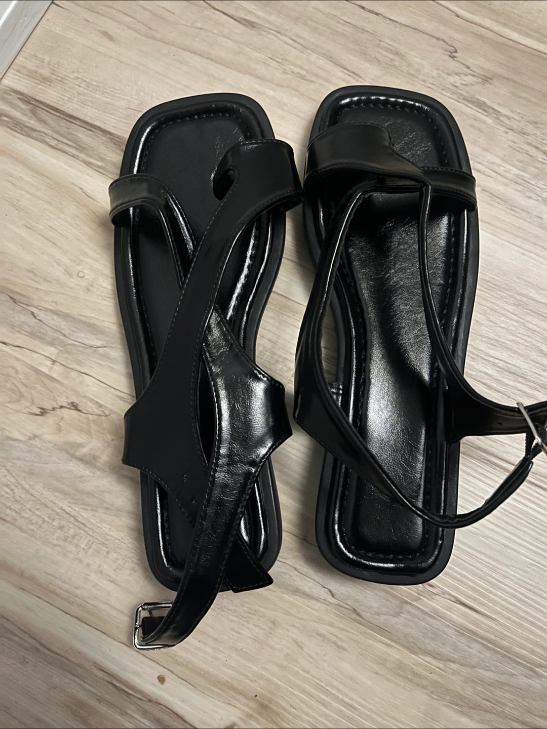Never worn pair of black sandals. Synthetic leather. The size is EU 39 , US 8. Exchange with me for an interesting , as good as new graphic Tshirt or 2 plain Tshirt (also open to other offers)