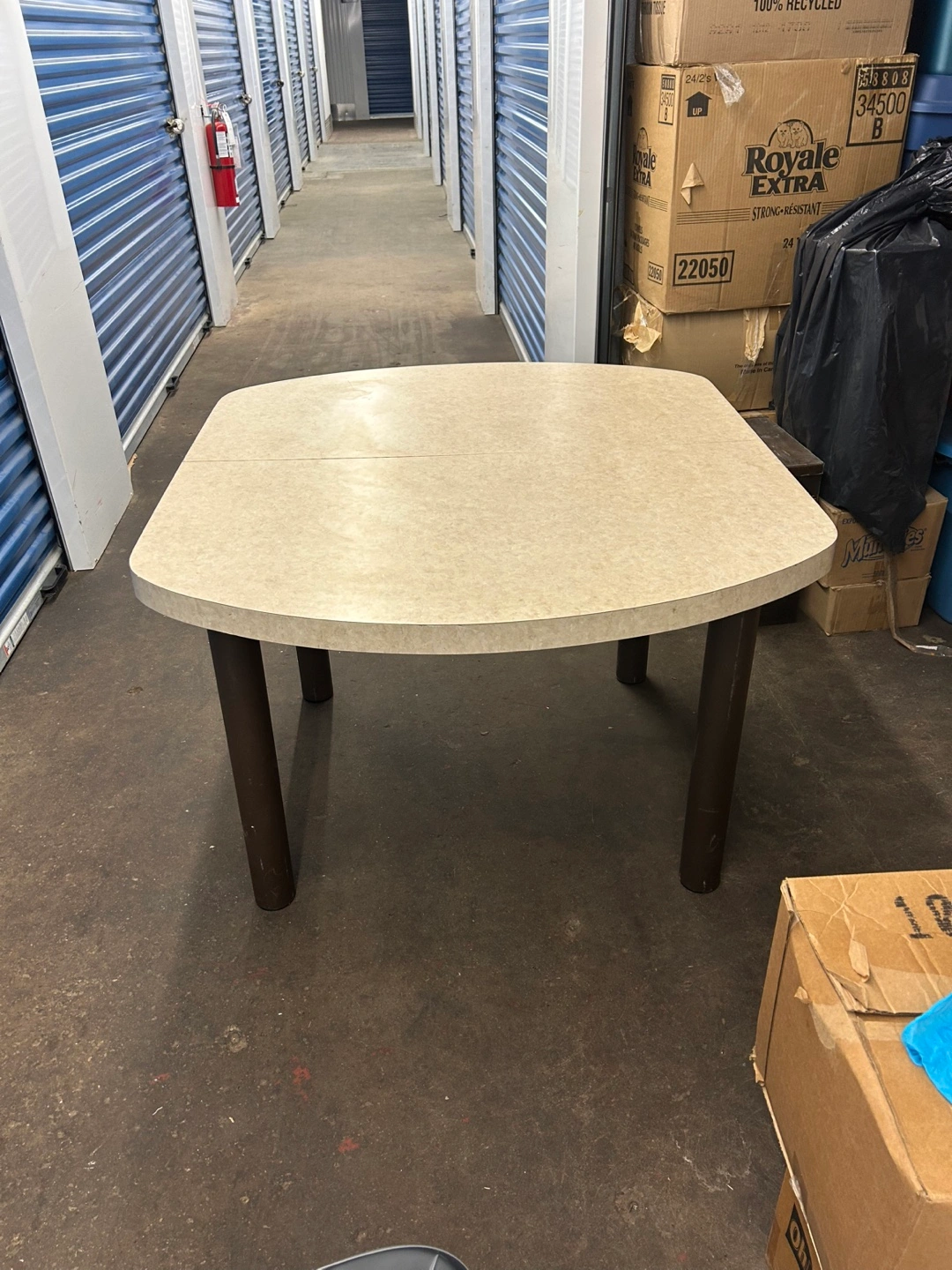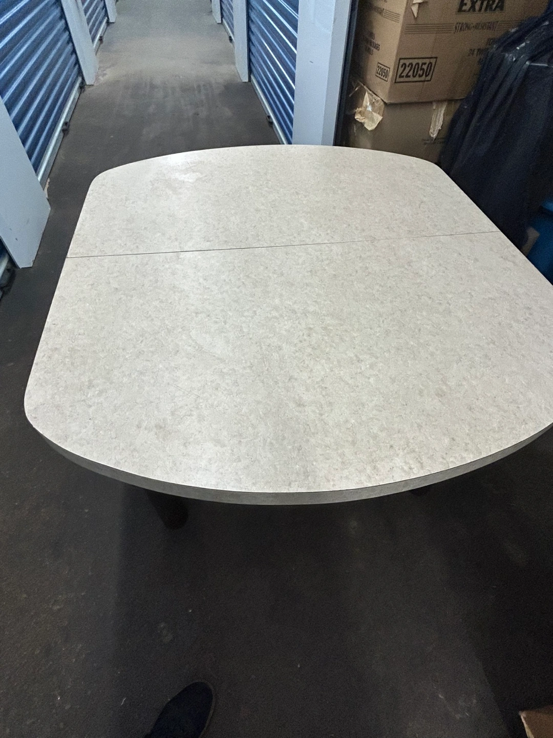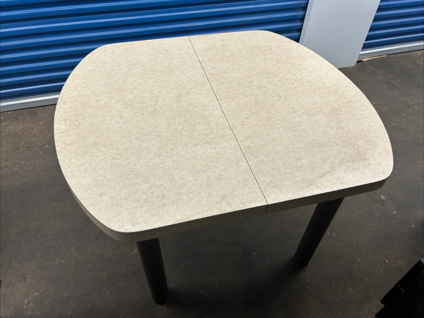 Selling a gently used kitchen/dining table. It's in good condition and perfect for a smaller space that needs to accommodate more people sometimes. The table has a neutral colour top and dark legs. Table only. No chairs. No insert.