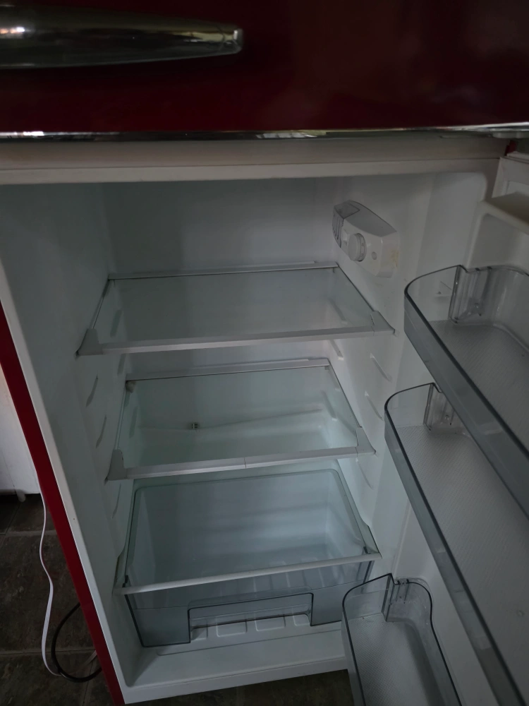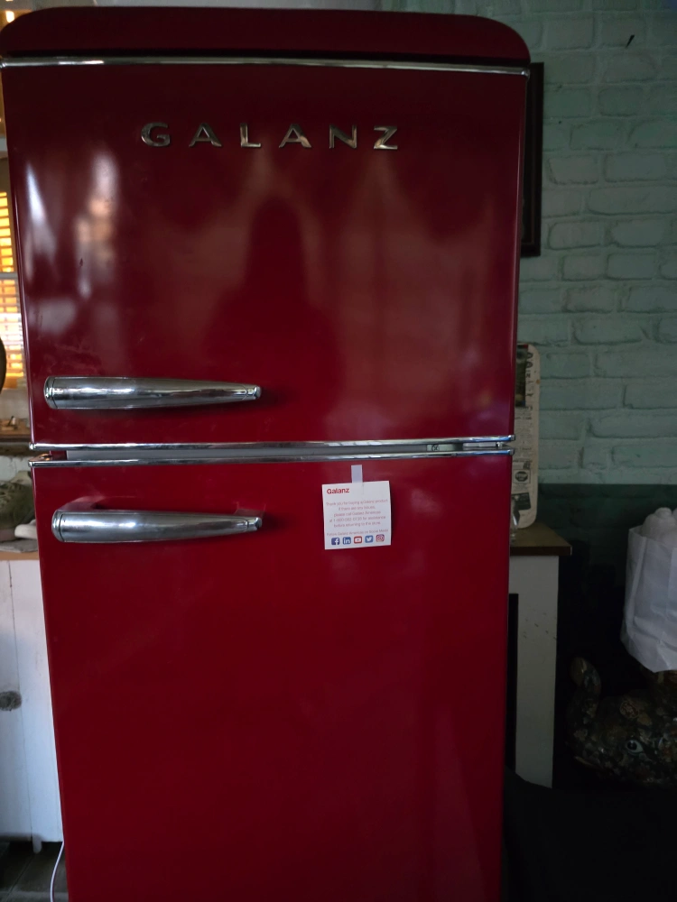 Selling a Galanz retro-style refrigerator in red. It has a unique look and is in good condition. Perfect for adding a pop of color to your kitchen or dorm room!