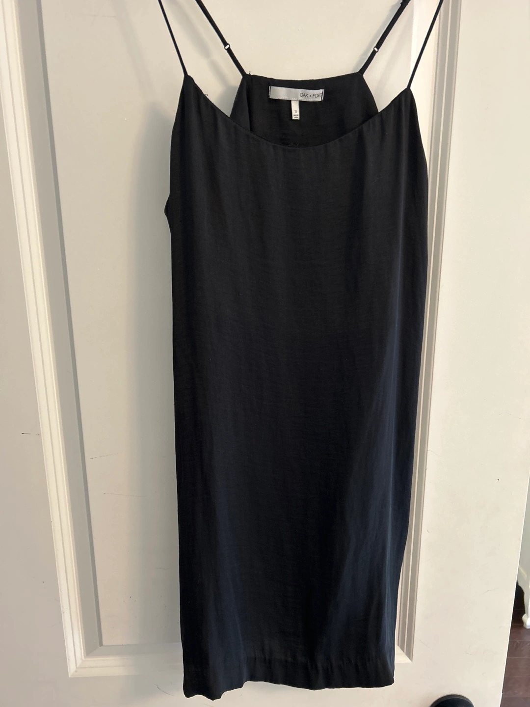 246Selling a simple black dress from Oak + Fort! It's a size small and in great condition. Perfect for a casual day out or dressed up for an evening event. The material is lightweight and comfortable, making it ideal for warmer weather! Adjustable straps. Length without straps: 26” Pit to pit: 17”