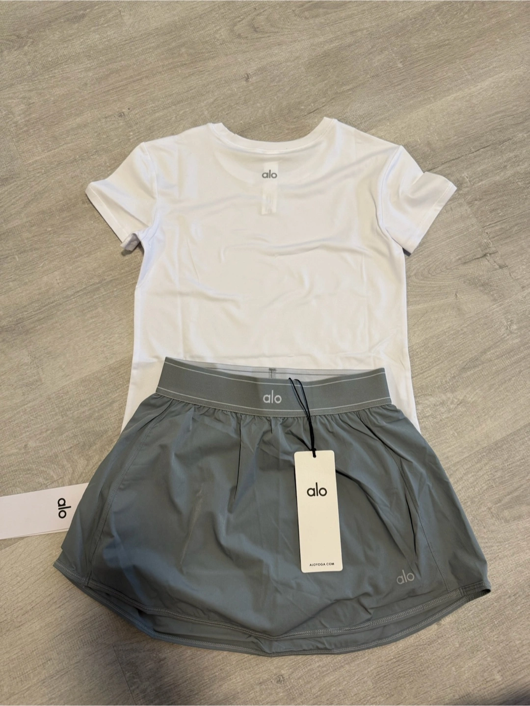 Selling a cute ALO set! Includes the Match Point tennis skirt and finesse t-shirt. Brand new and authentic with tags. The skirt features a lightweight, flowy fabric and built-in shorts for comfort and practicality. Limited edition colour for skirt. Perfect for your next tennis match or workout!