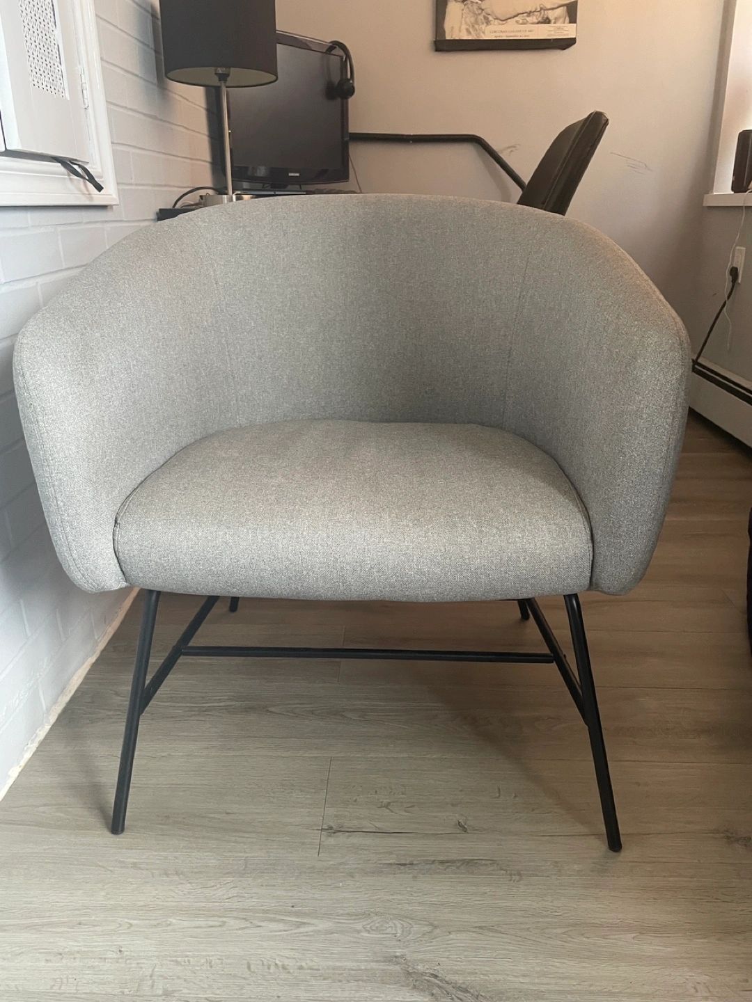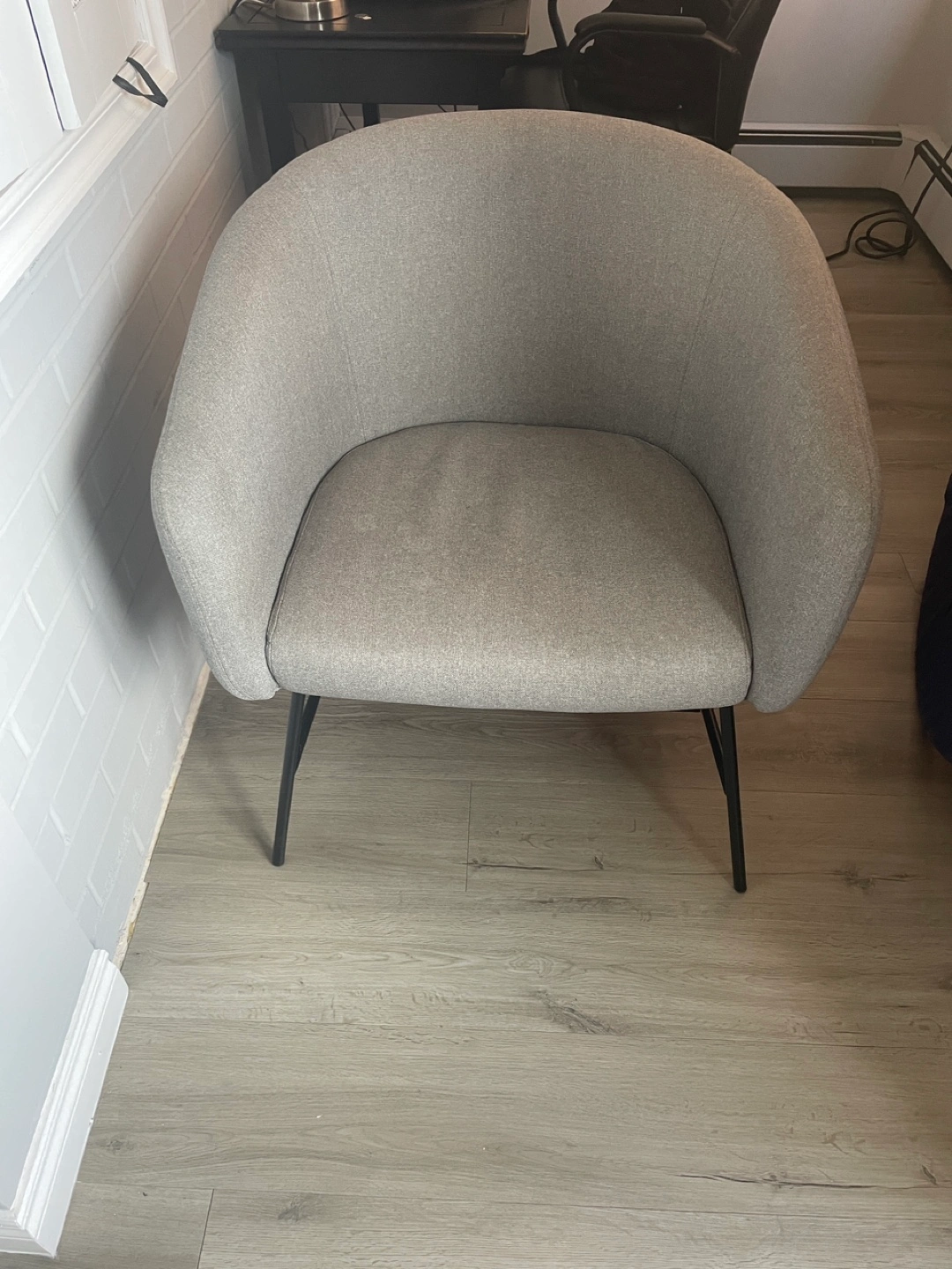 Selling a comfy grey accent chair! It's in great shape and would look lovely in any room. Perfect for adding a touch of style and comfort to your space
