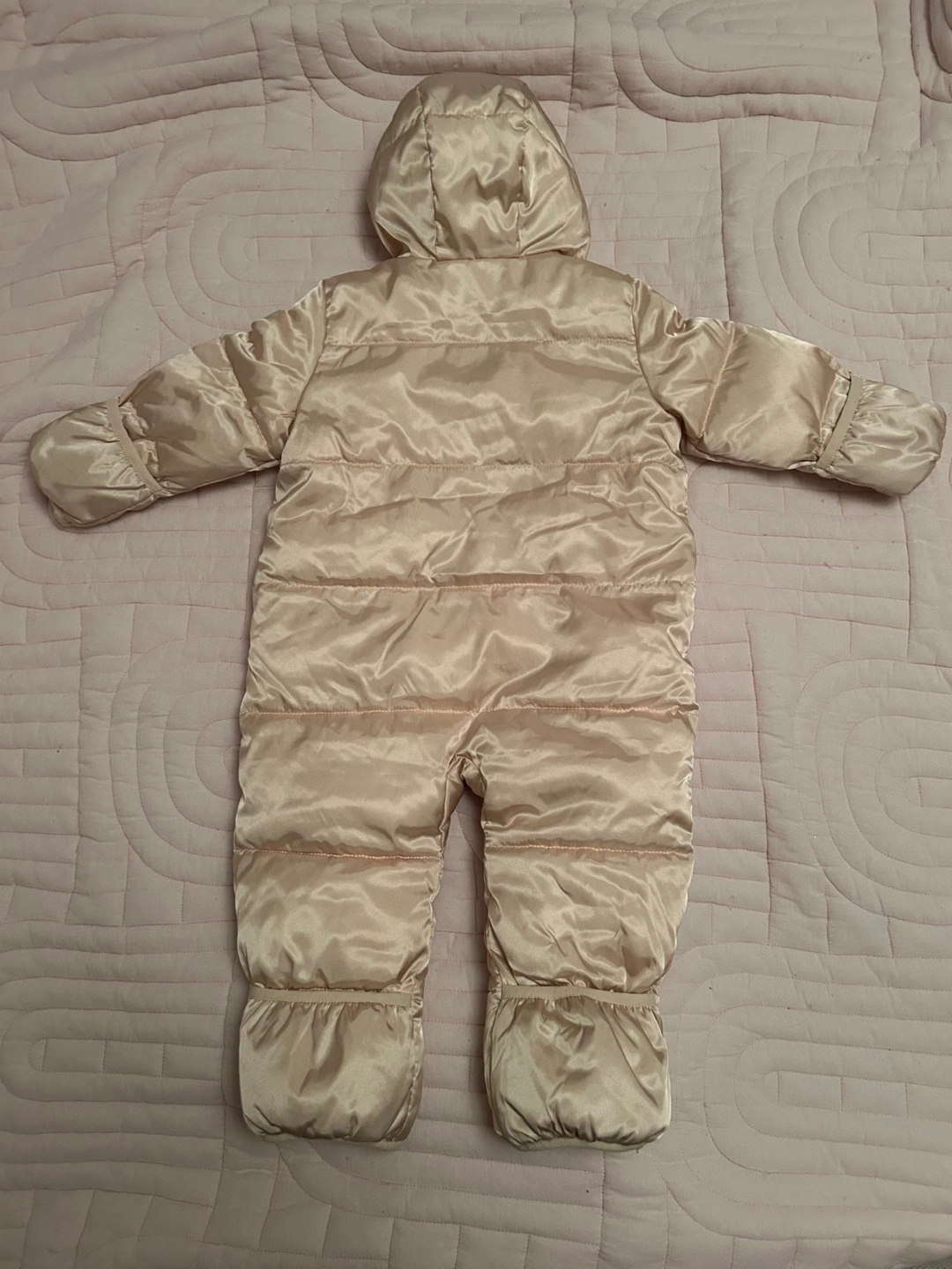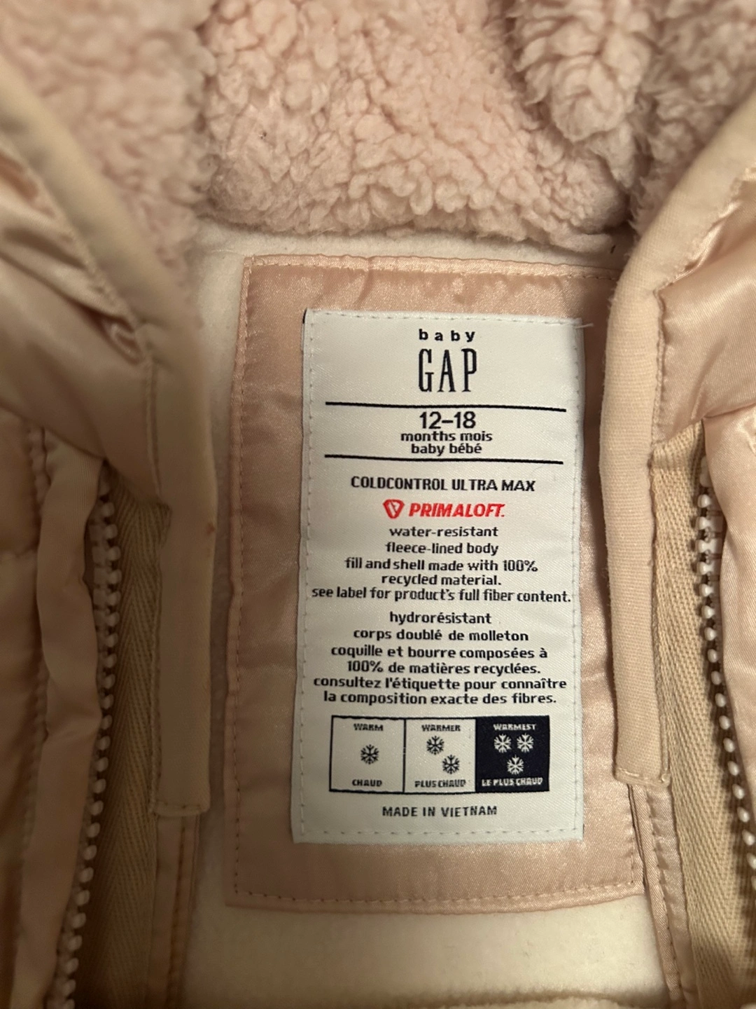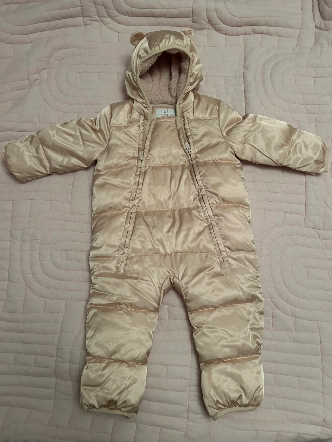 Keep your little one warm this winter with this adorable babyGap snowsuit! It's in great condition and sized for 12-18 months. Features a water-resistant fleece-lined body and Primaloft insulation for ultra max cold control. Sleeves fold over to keep little hands warm. Perfect for those snowy days!